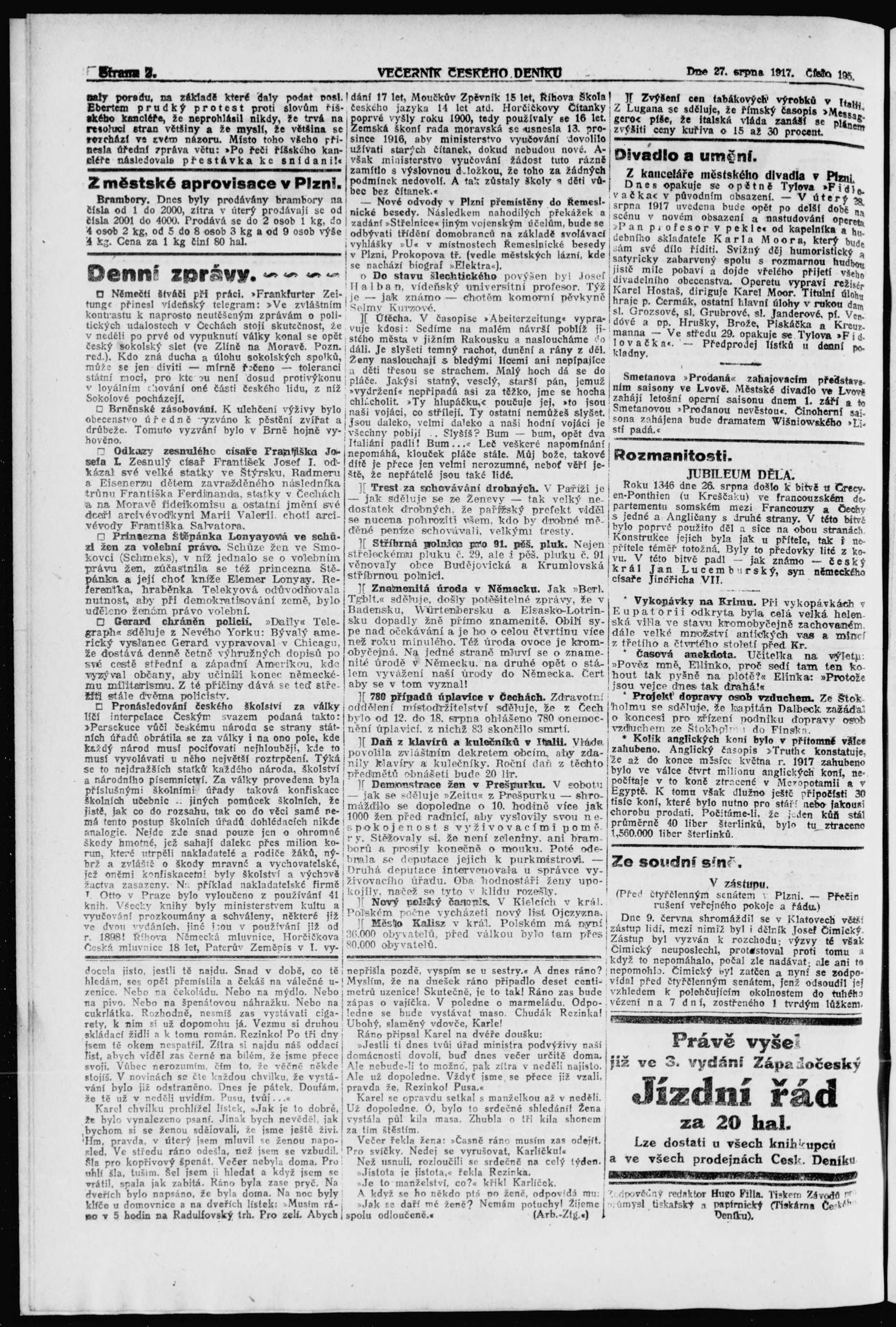 * Datum vydání výtisku: 27.8.1917 Číslo výtisku: 195 Poznámky k výtisku: večerní vydání;