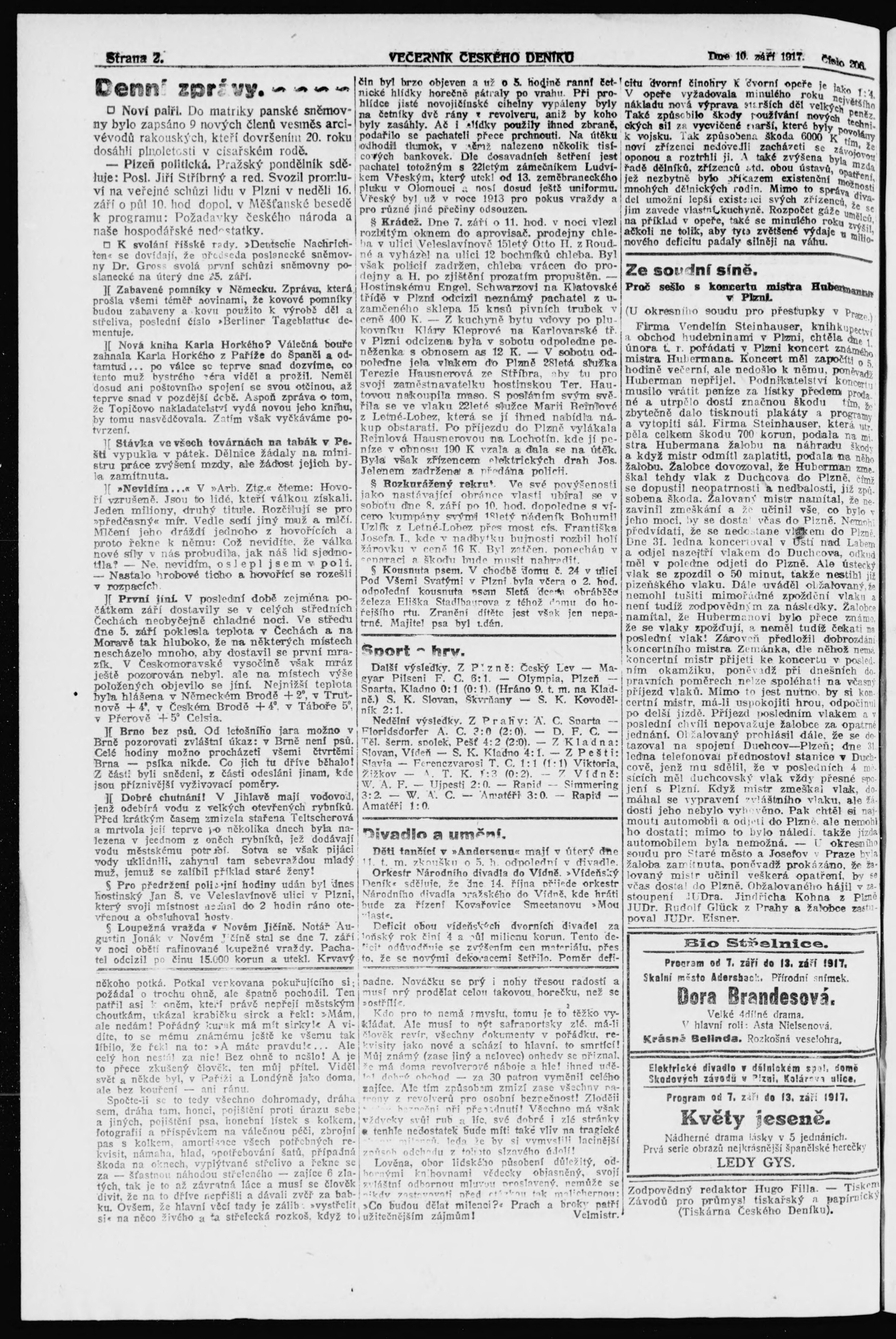 * Datum vydání výtisku: 10.9.1917 Číslo výtisku: 206 Poznámky k výtisku: večerní vydání;