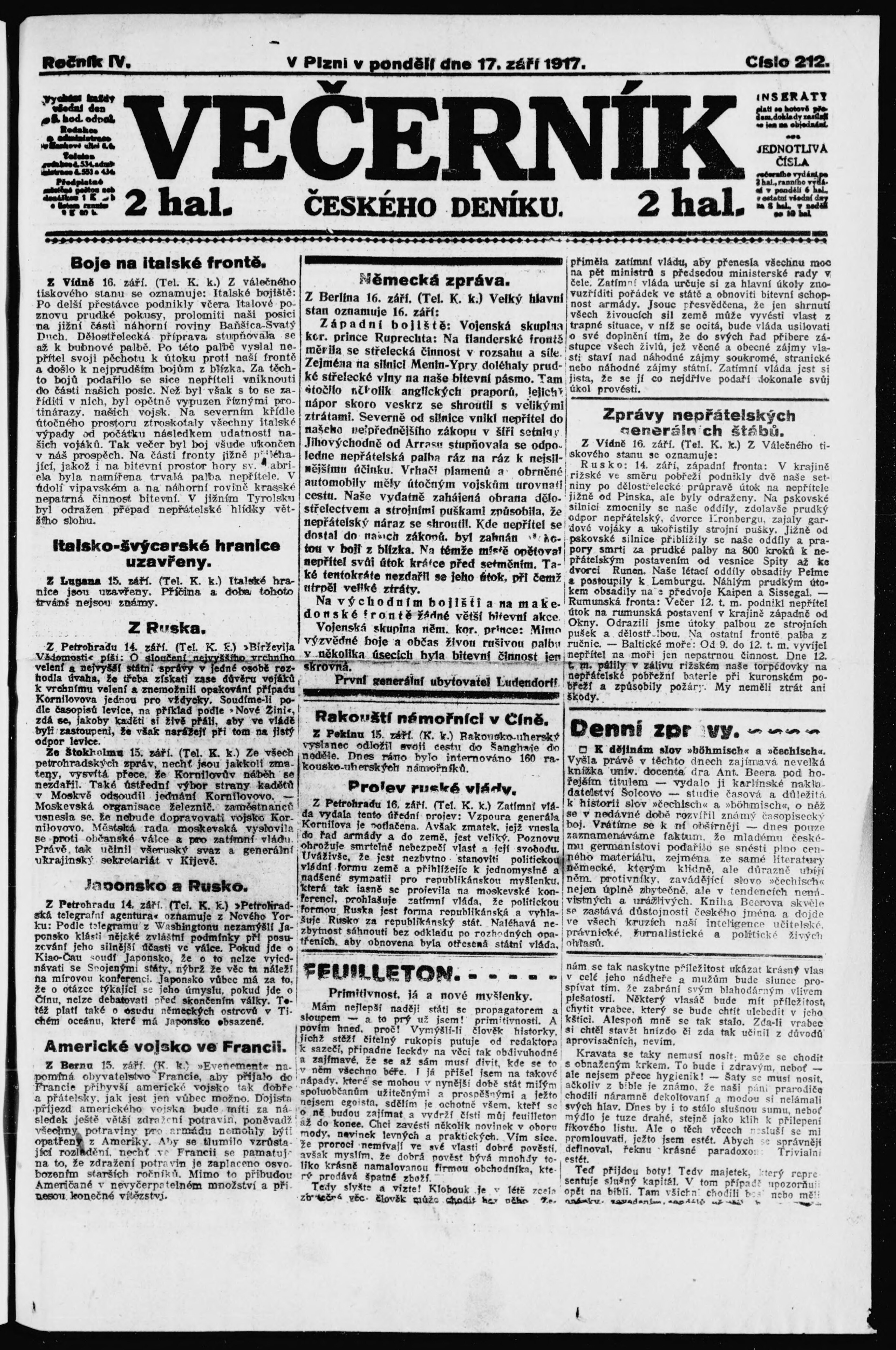 * Datum vydání výtisku: 17.9.1917 Číslo výtisku: 212 Poznámky k výtisku: večerní vydání;
