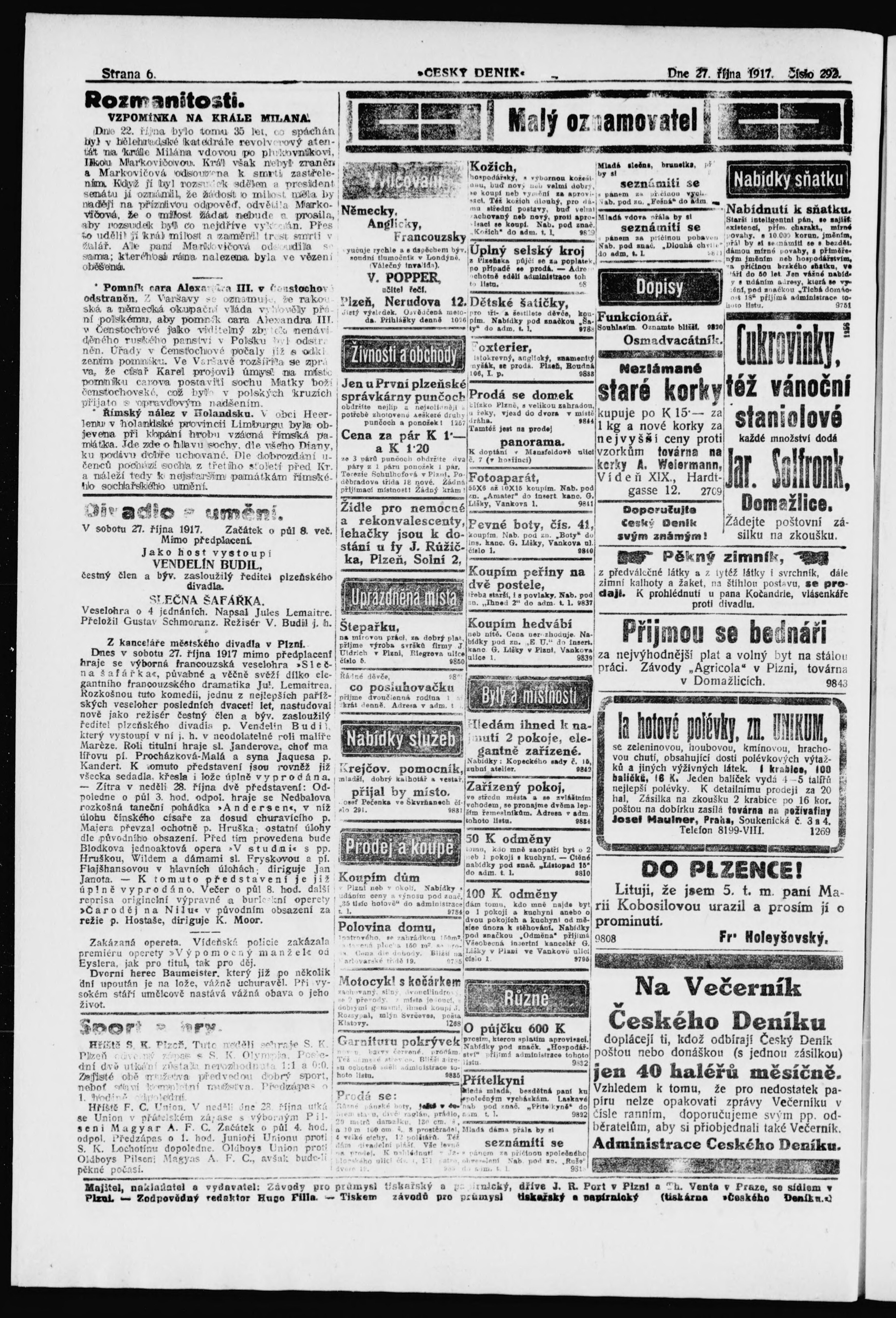 * Datum vydání výtisku: 27.10.1917 Číslo výtisku: 292
