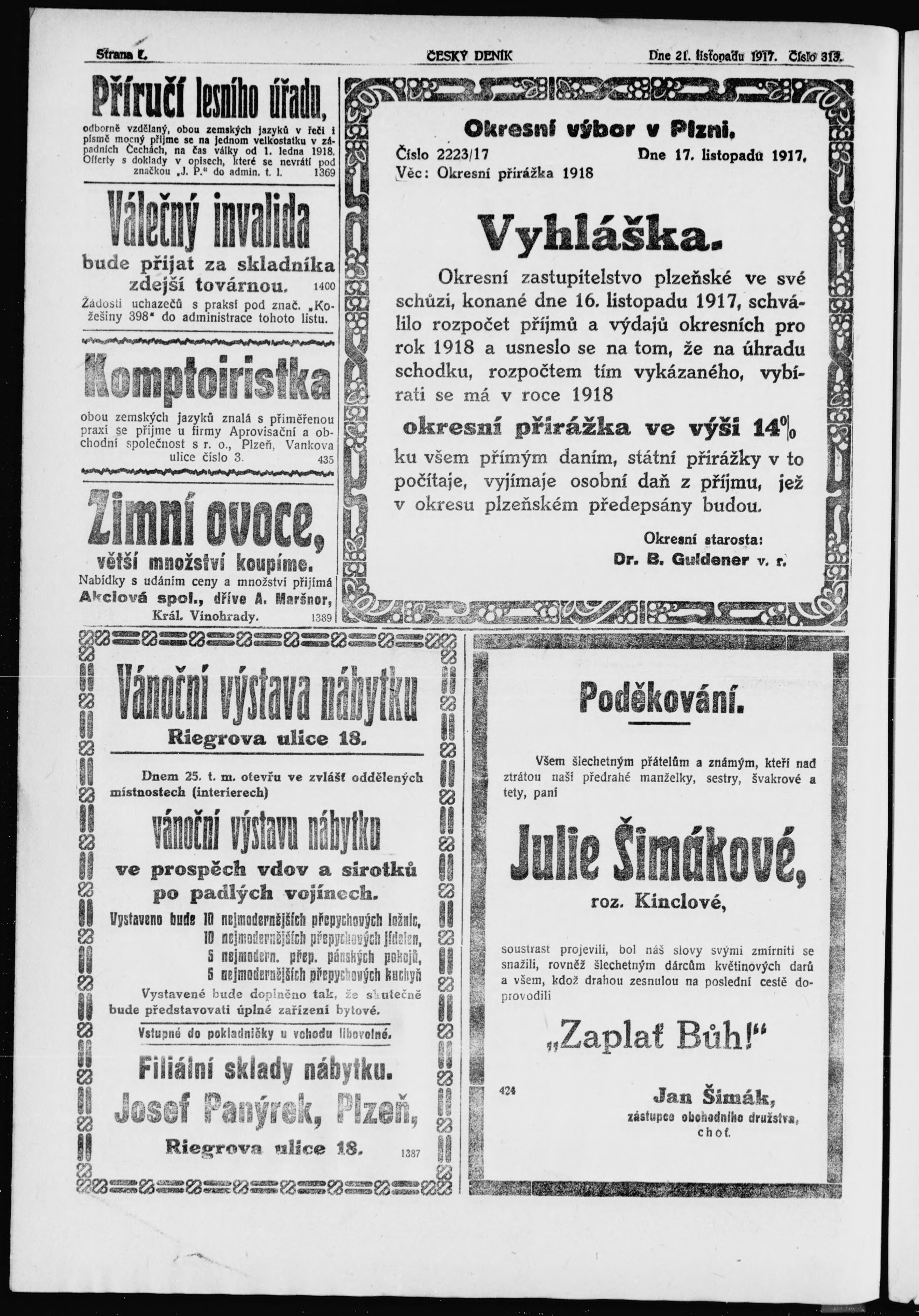 * Datum vydání výtisku: 21.11.1917 Číslo výtisku: 313