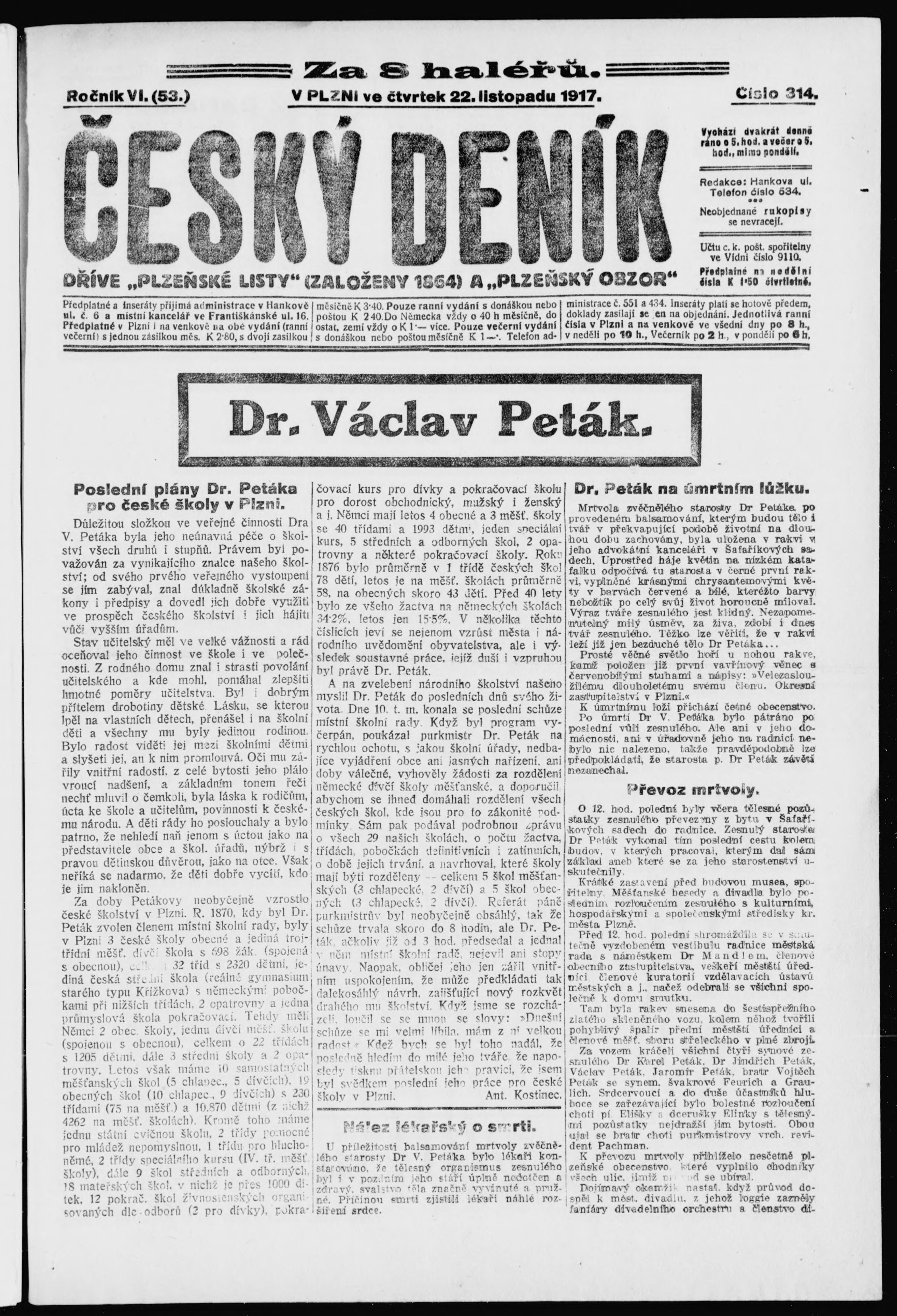* Datum vydání výtisku: 22.11.1917 Číslo výtisku: 314