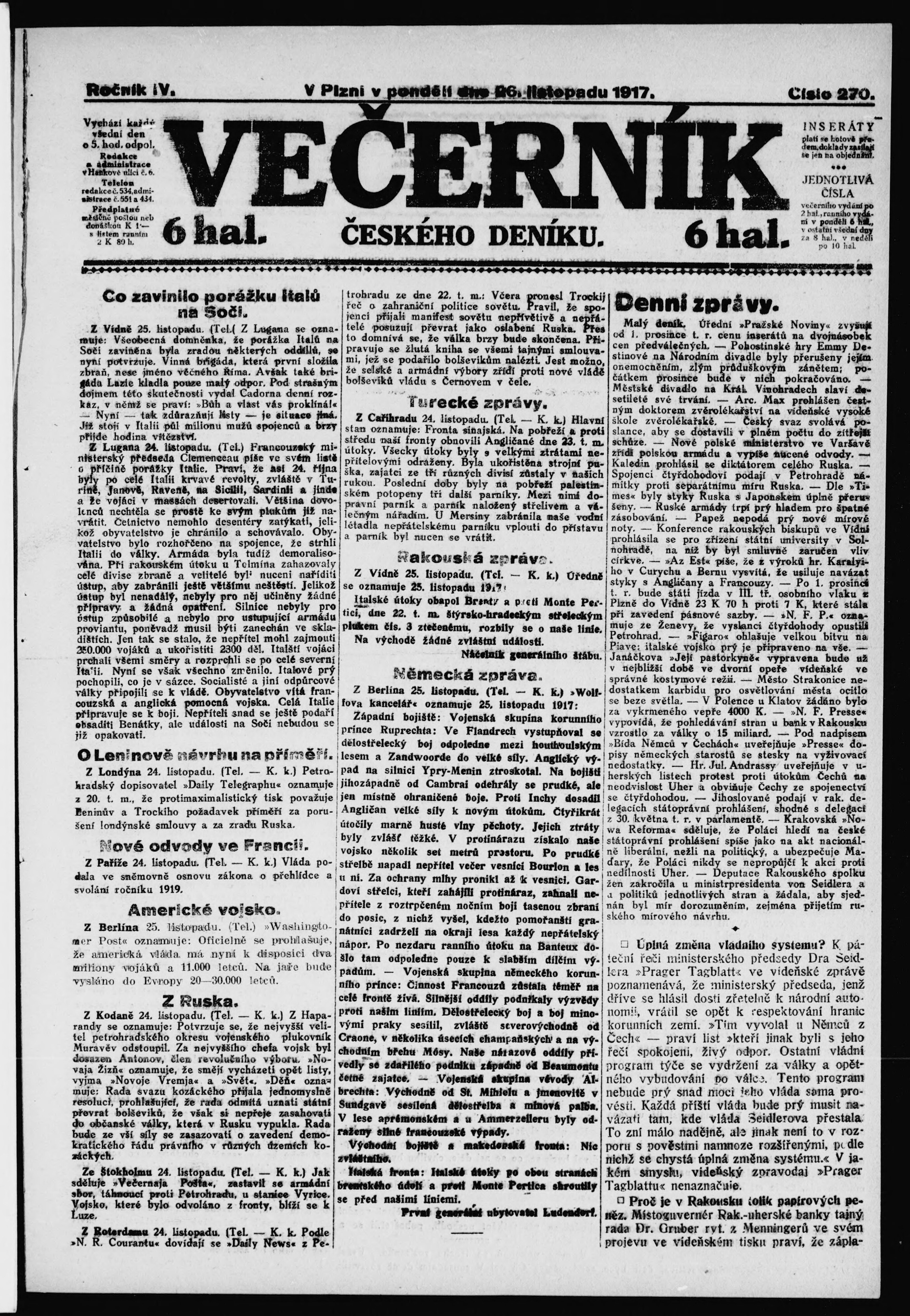 * Datum vydání výtisku: 26.11.1917 Číslo výtisku: 270 Poznámky k výtisku: večerní vydání;