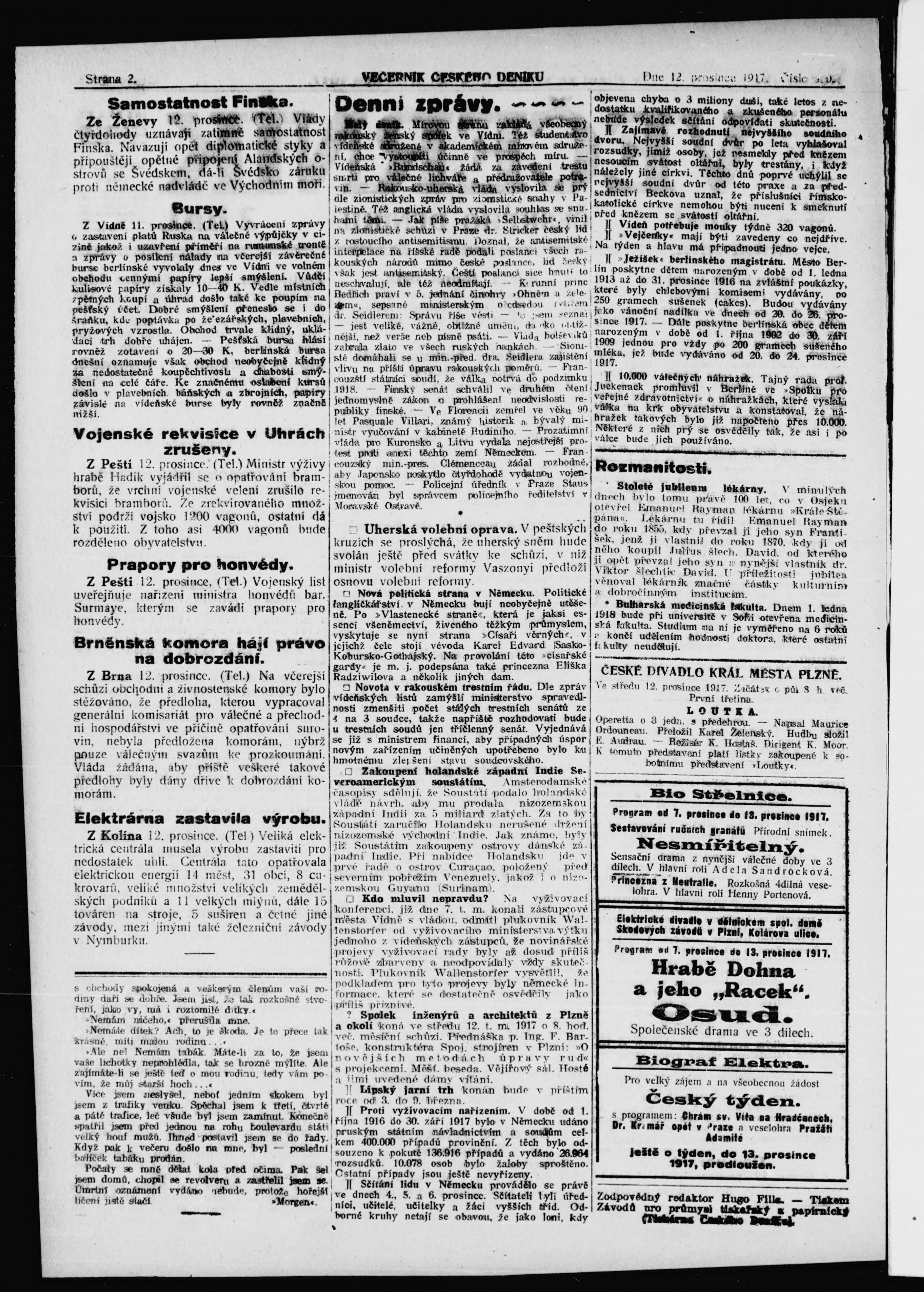 * Datum vydání výtisku: 12.12.1917 Číslo výtisku: 283 Poznámky k výtisku: večerní vydání;