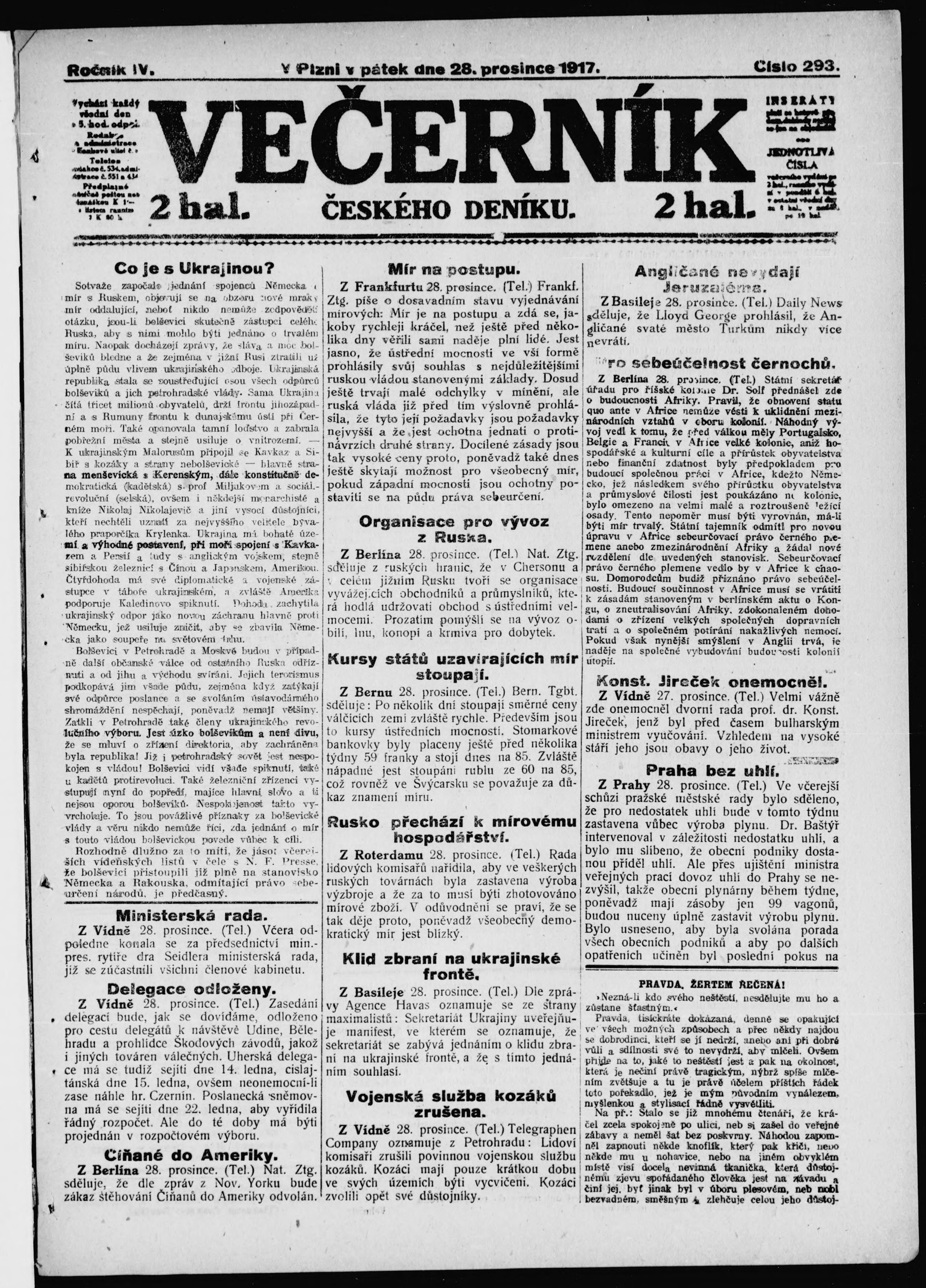 * Datum vydání výtisku: 28.12.1917 Číslo výtisku: 293 Poznámky k výtisku: večerní vydání;