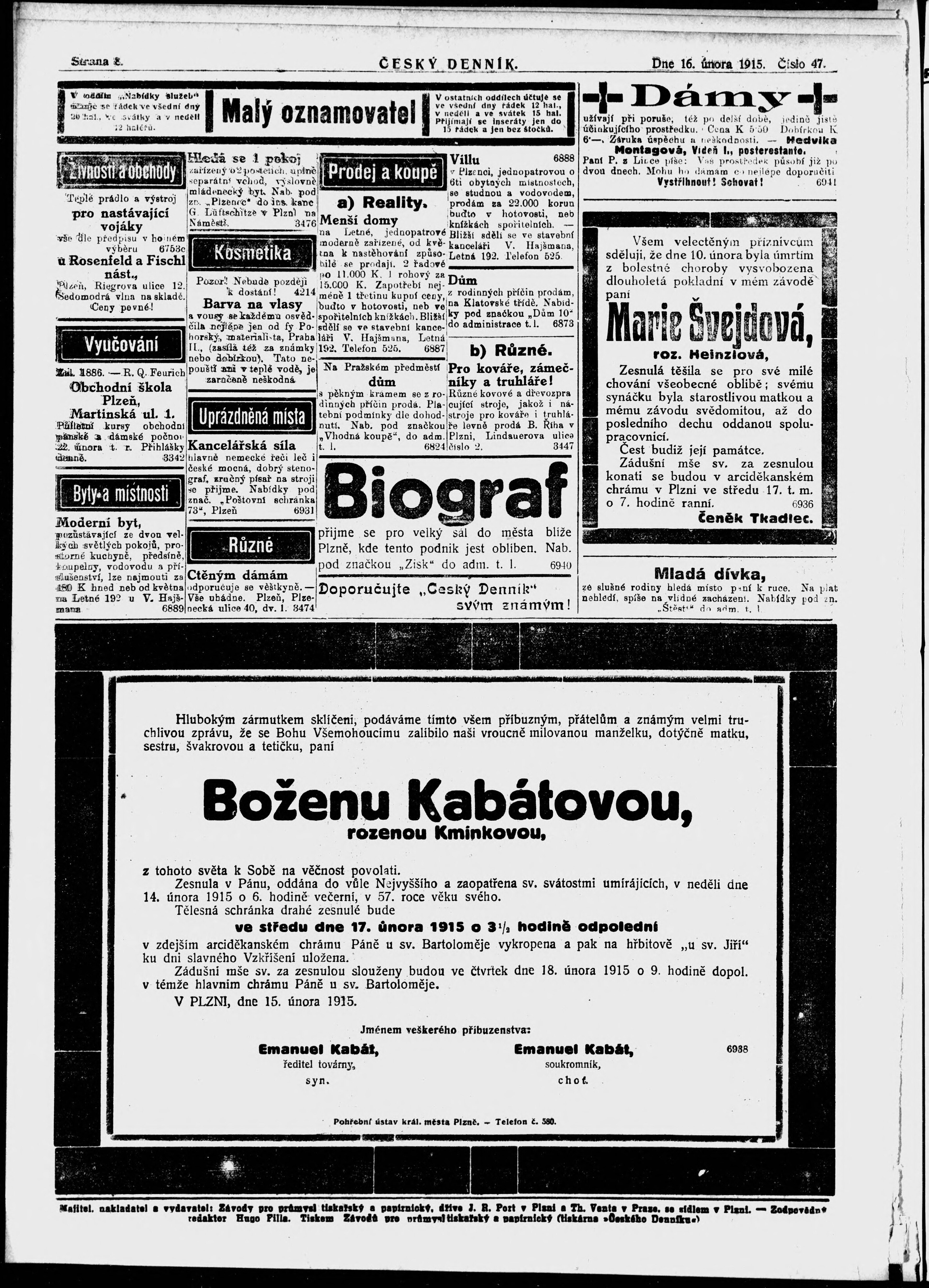 * Datum vydání výtisku: 16.2.1915 Číslo výtisku: 47