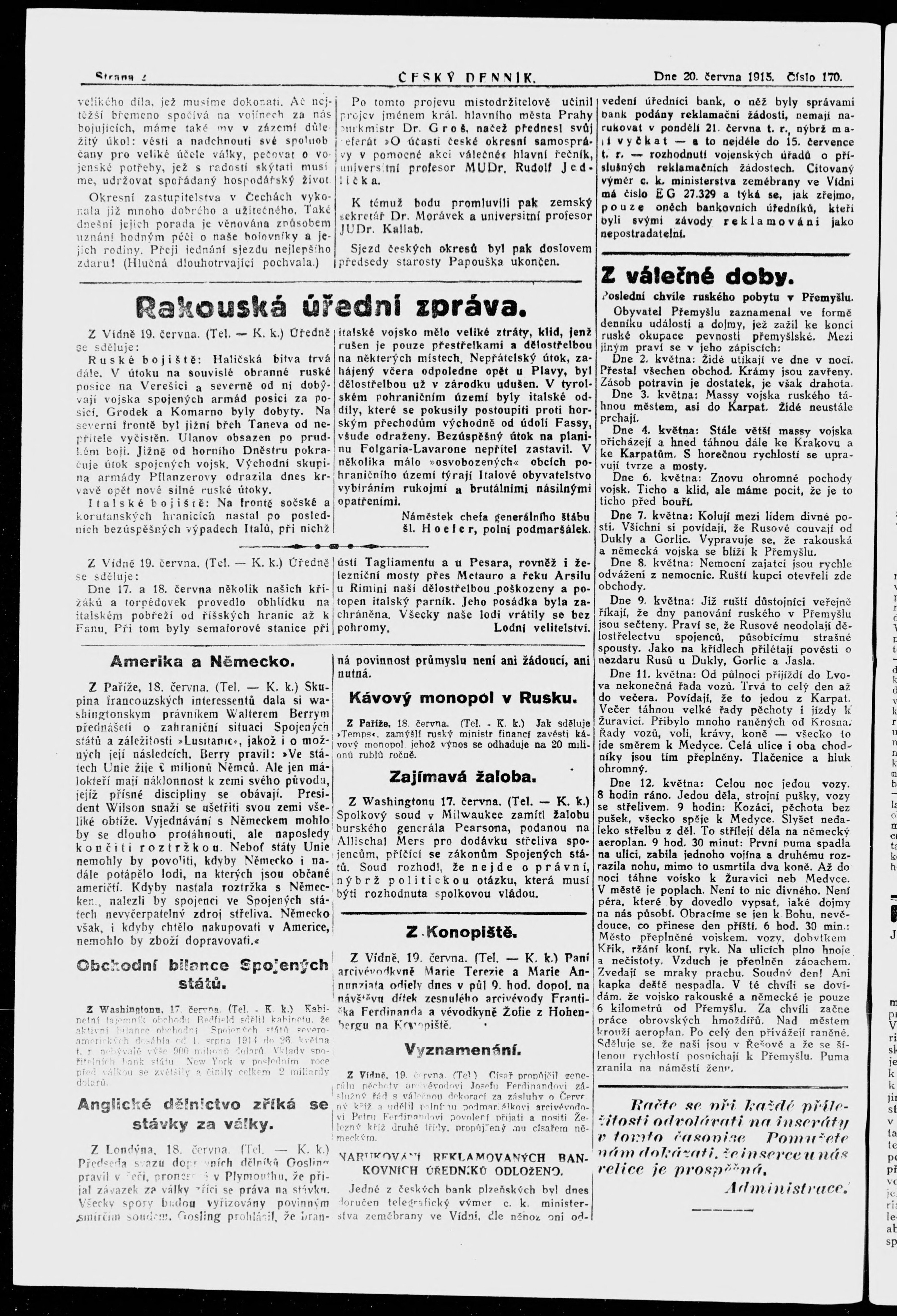 * Datum vydání výtisku: 20.6.1915 Číslo výtisku: 170