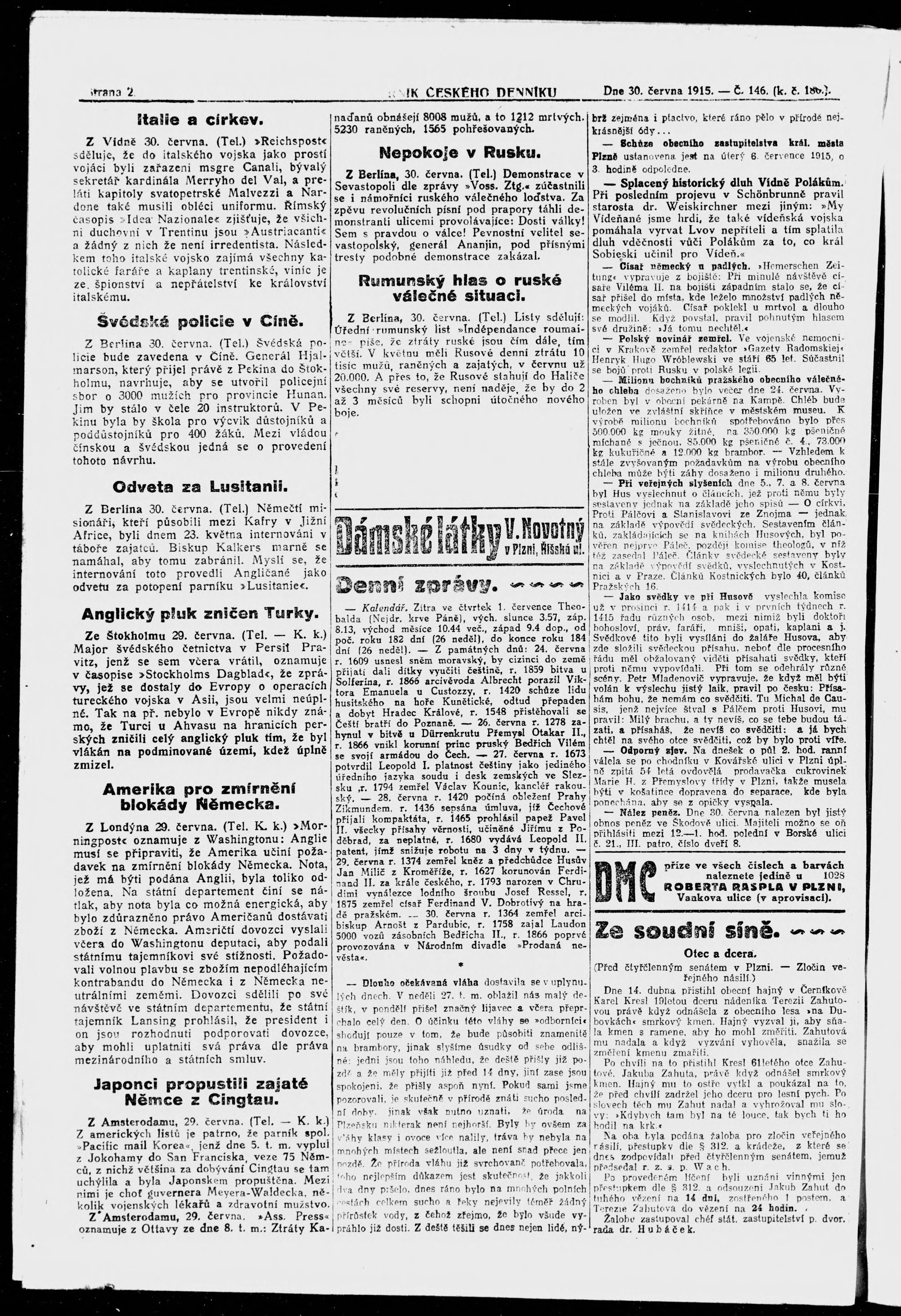 * Datum vydání výtisku: 30.6.1915 Číslo výtisku: 146 Poznámky k výtisku: večerní vydání;
