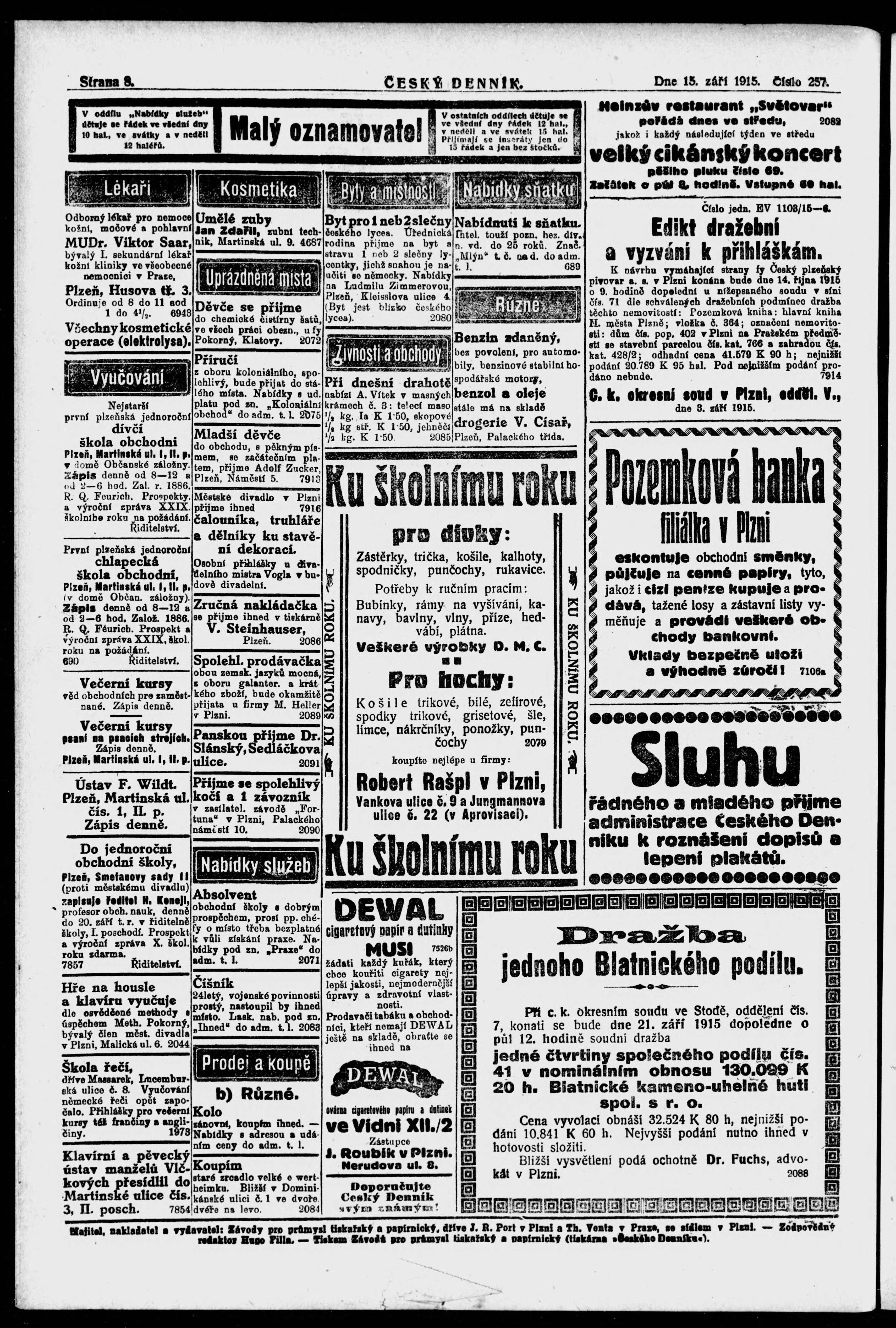 * Datum vydání výtisku: 15.9.1915 Číslo výtisku: 257