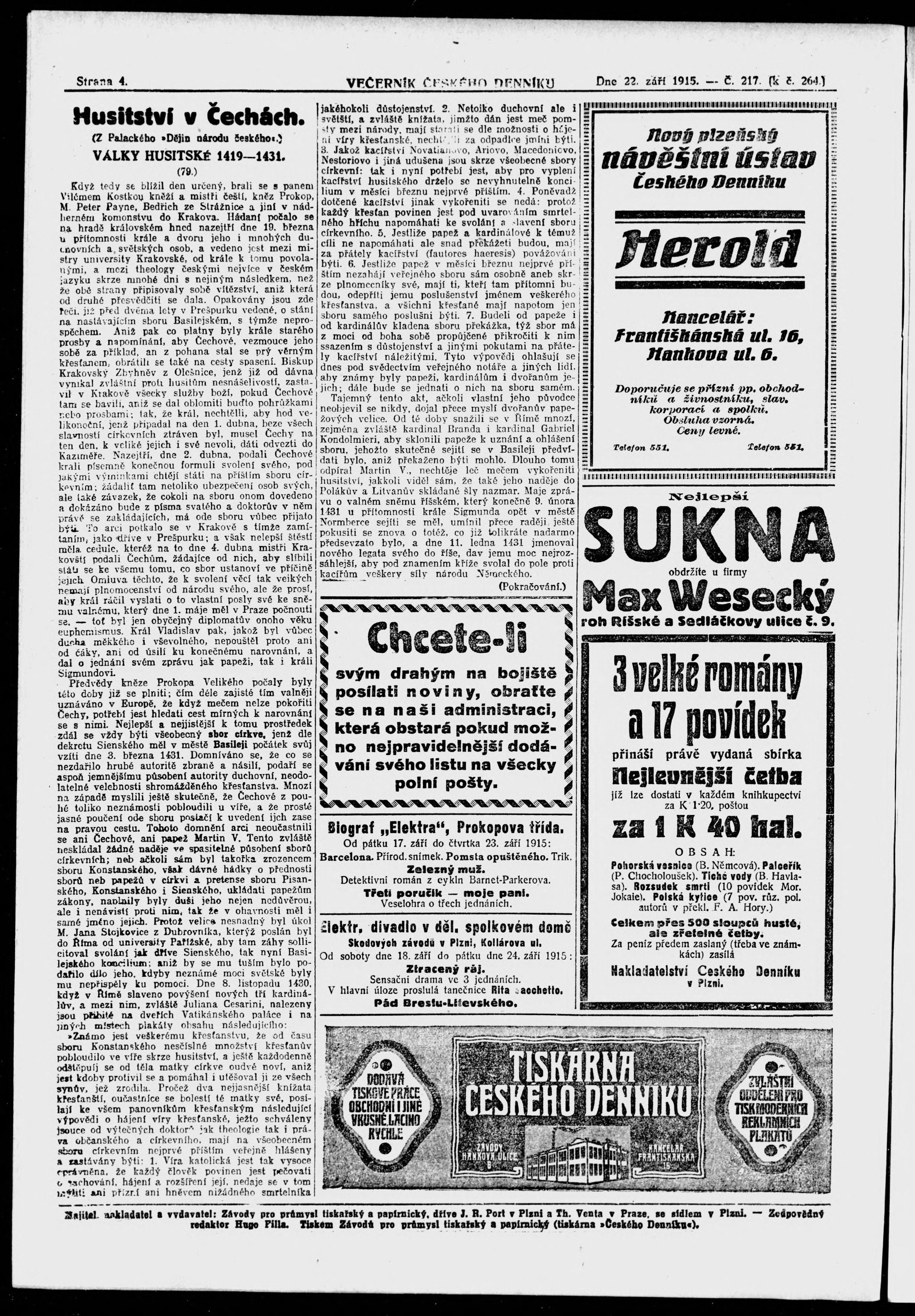 * Datum vydání výtisku: 22.9.1915 Číslo výtisku: 217 Poznámky k výtisku: večerní vydání;