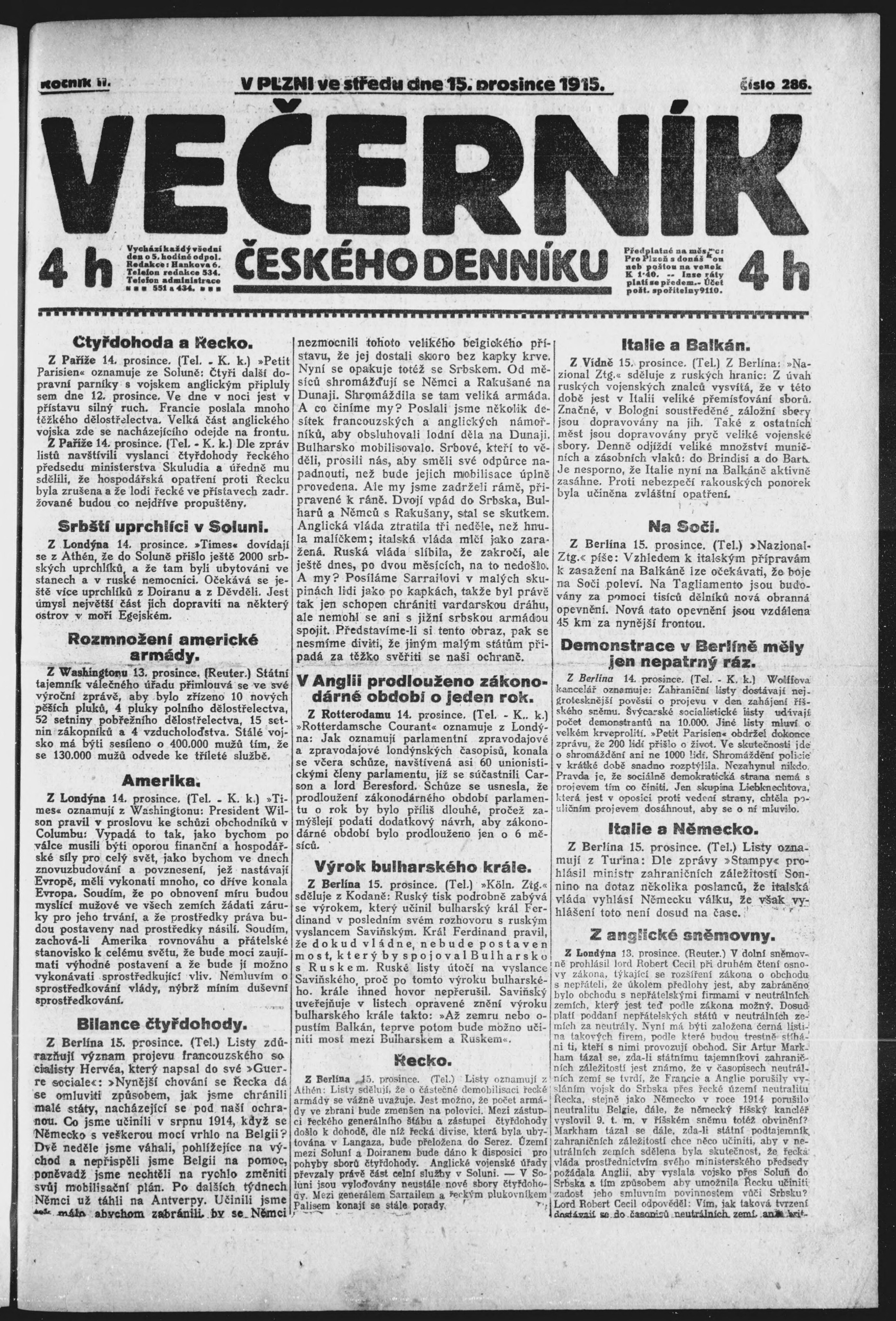 * Datum vydání výtisku: 15.12.1915 Číslo výtisku: 286 Poznámky k výtisku: večerní vydání;