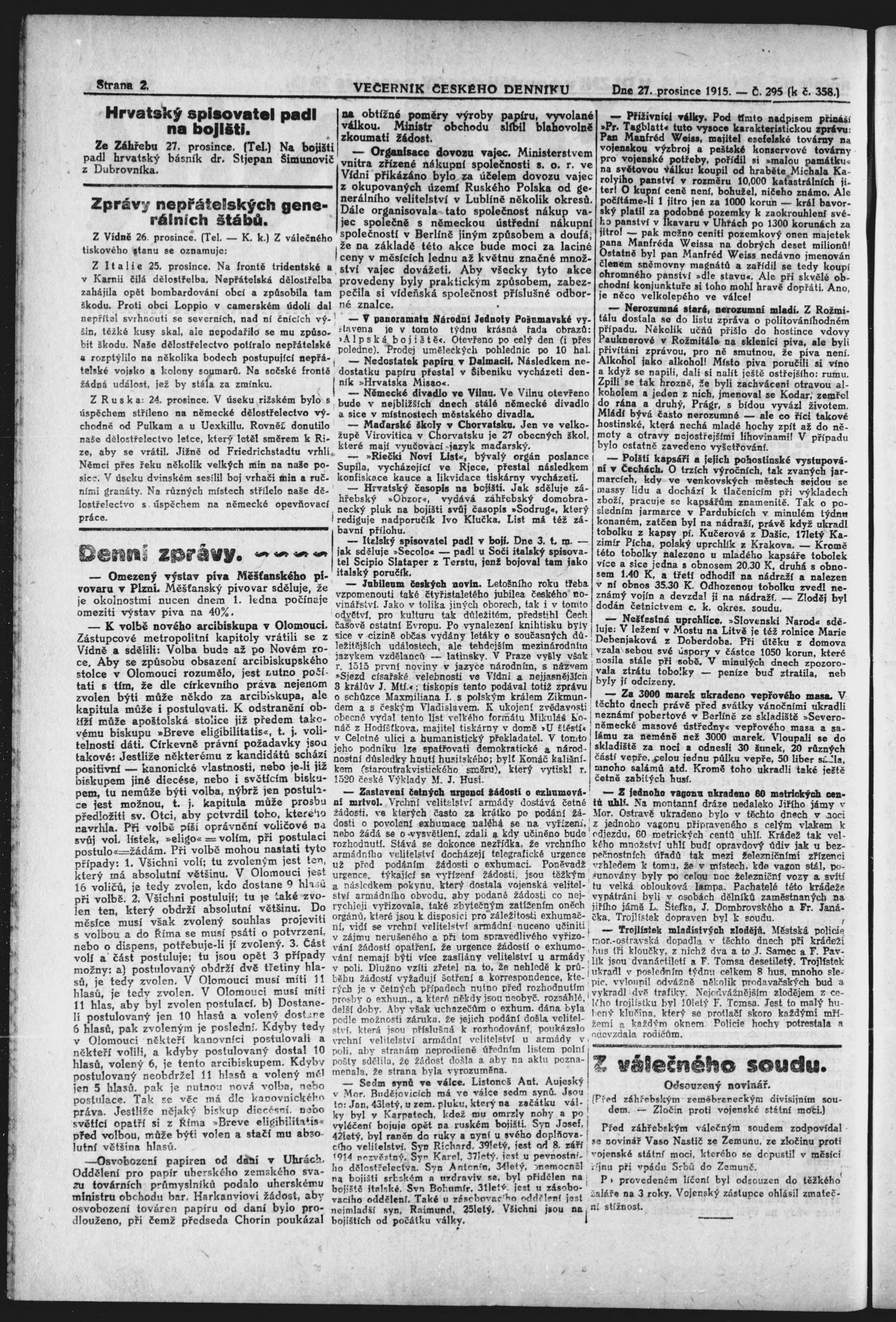 * Datum vydání výtisku: 27.12.1915 Číslo výtisku: 295 Poznámky k výtisku: večerní vydání;