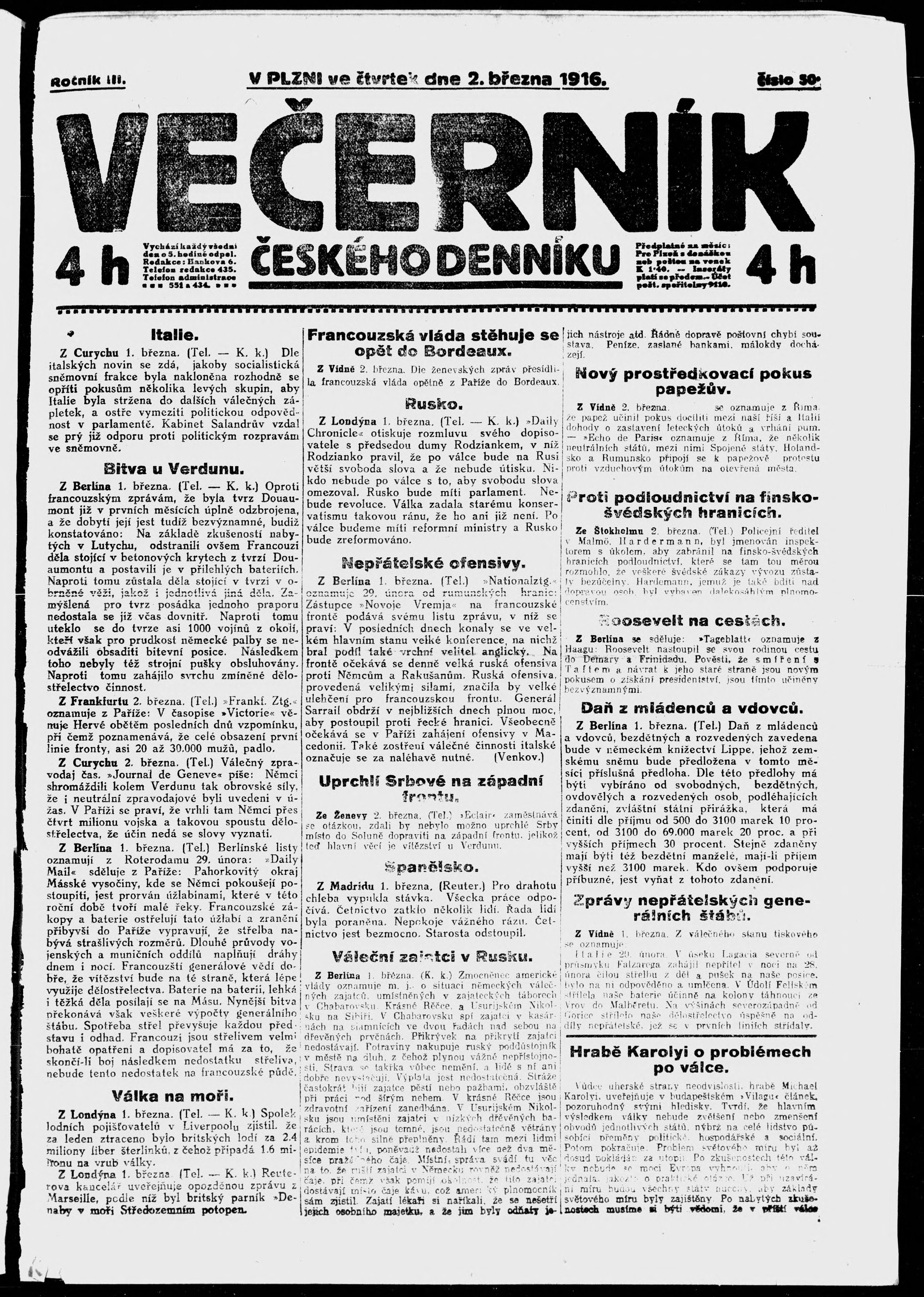 * Datum vydání výtisku: 2.3.1916 Číslo výtisku: 50 Poznámky k výtisku: večerní vydání;