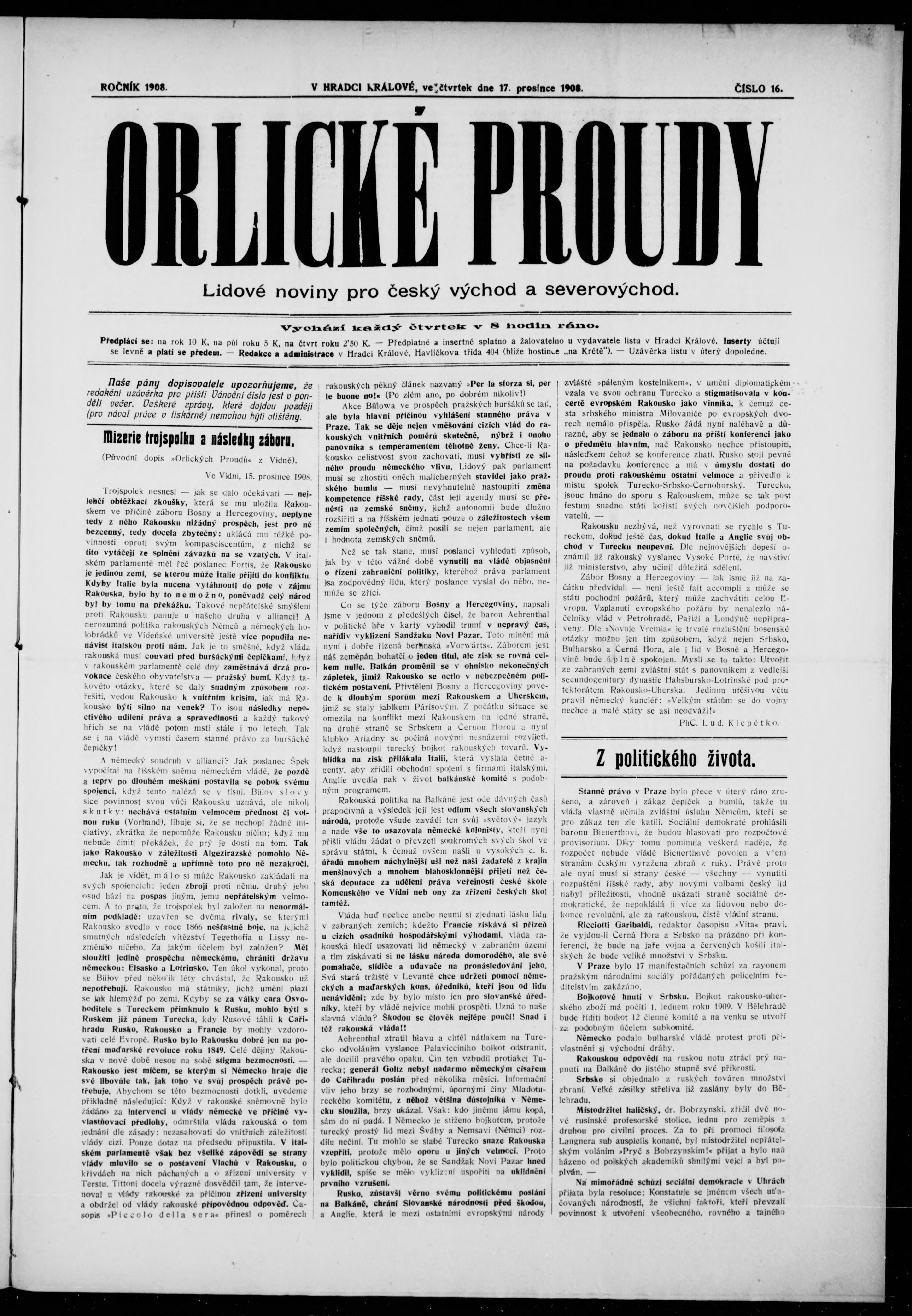 * Datum vydání výtisku: 17.12.1908 Číslo výtisku: 16