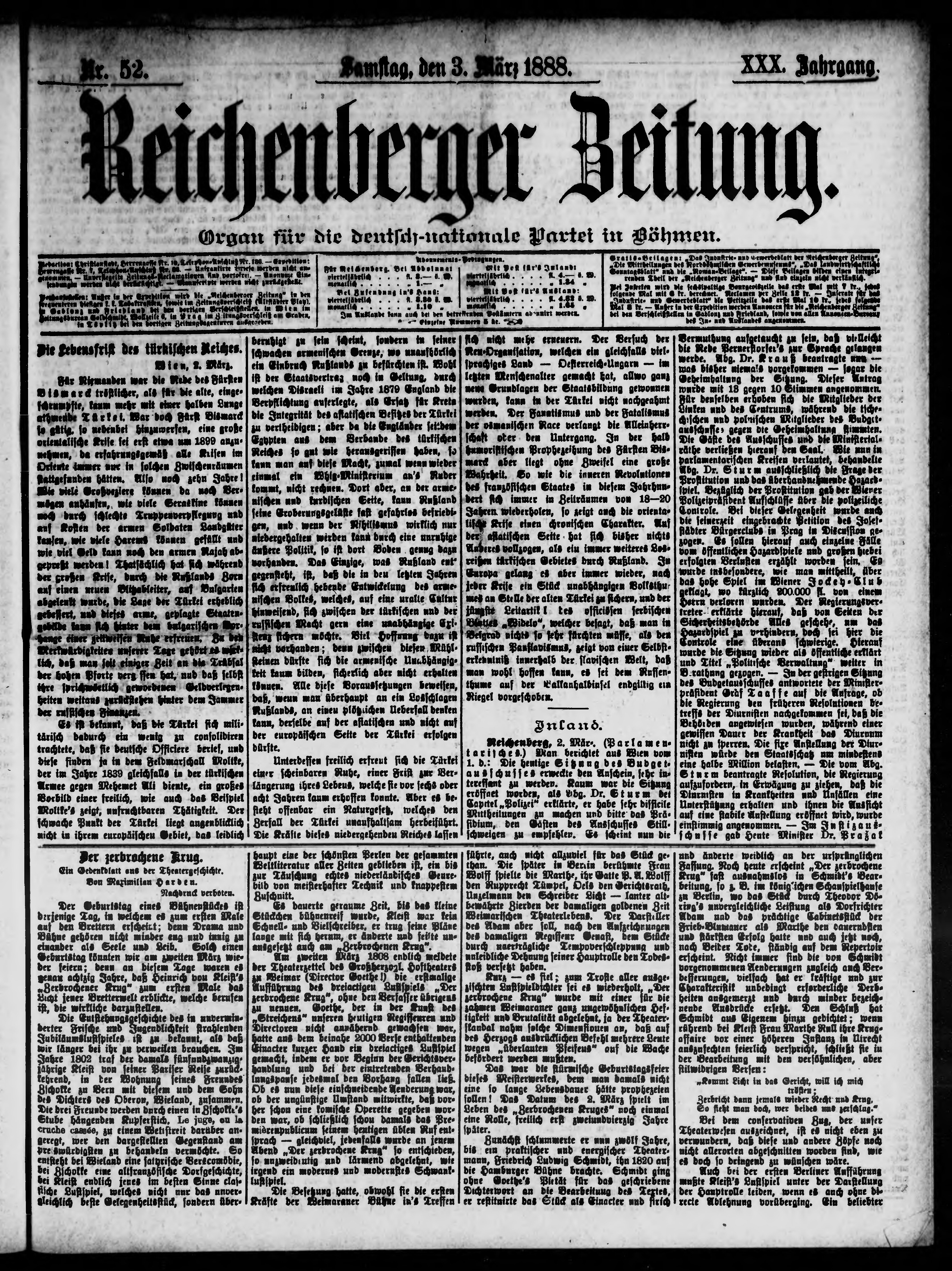 * Datum vydání výtisku: 3.3.1888 Číslo výtisku: 52