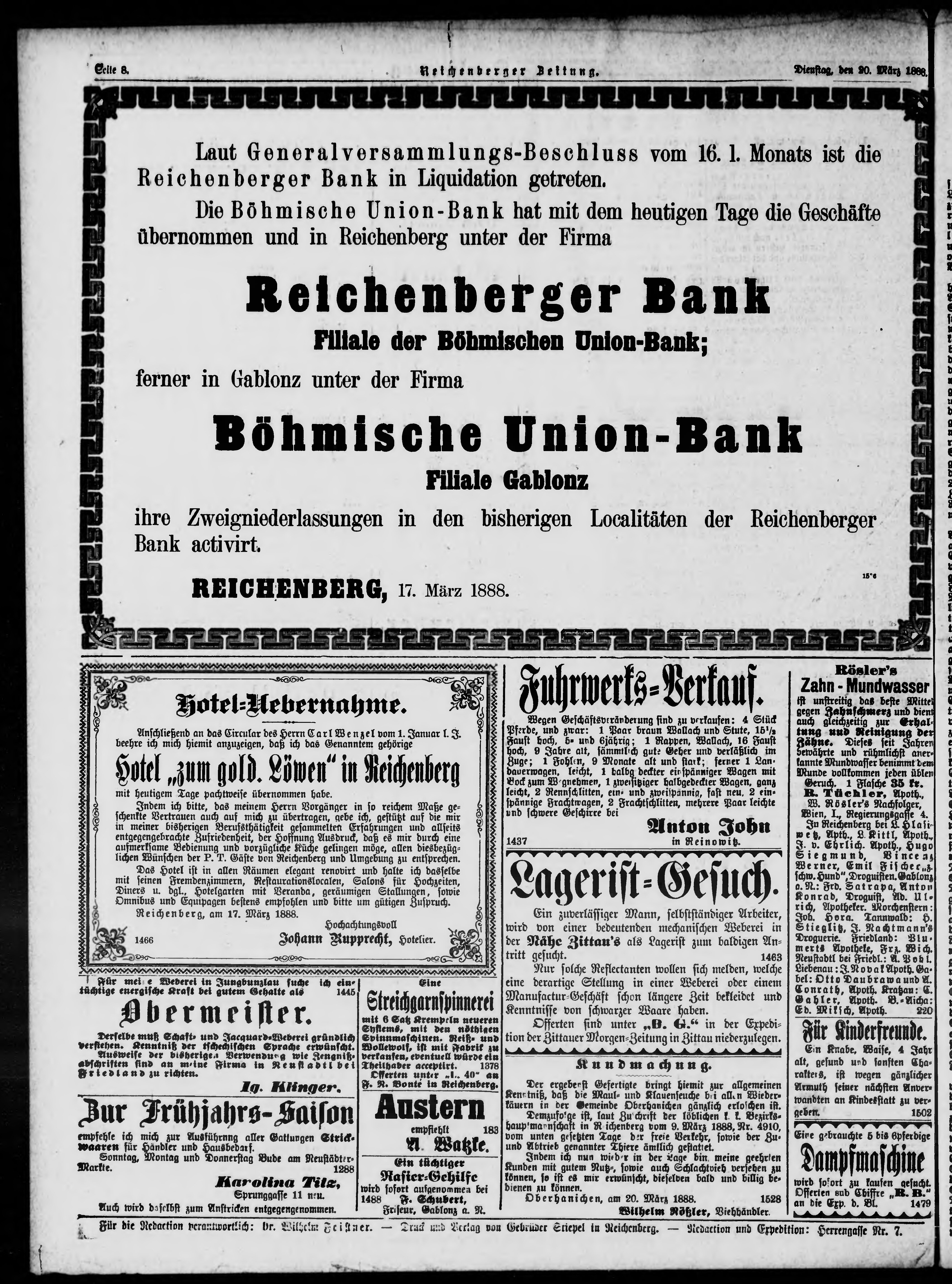 * Datum vydání výtisku: 20.3.1888 Číslo výtisku: 66
