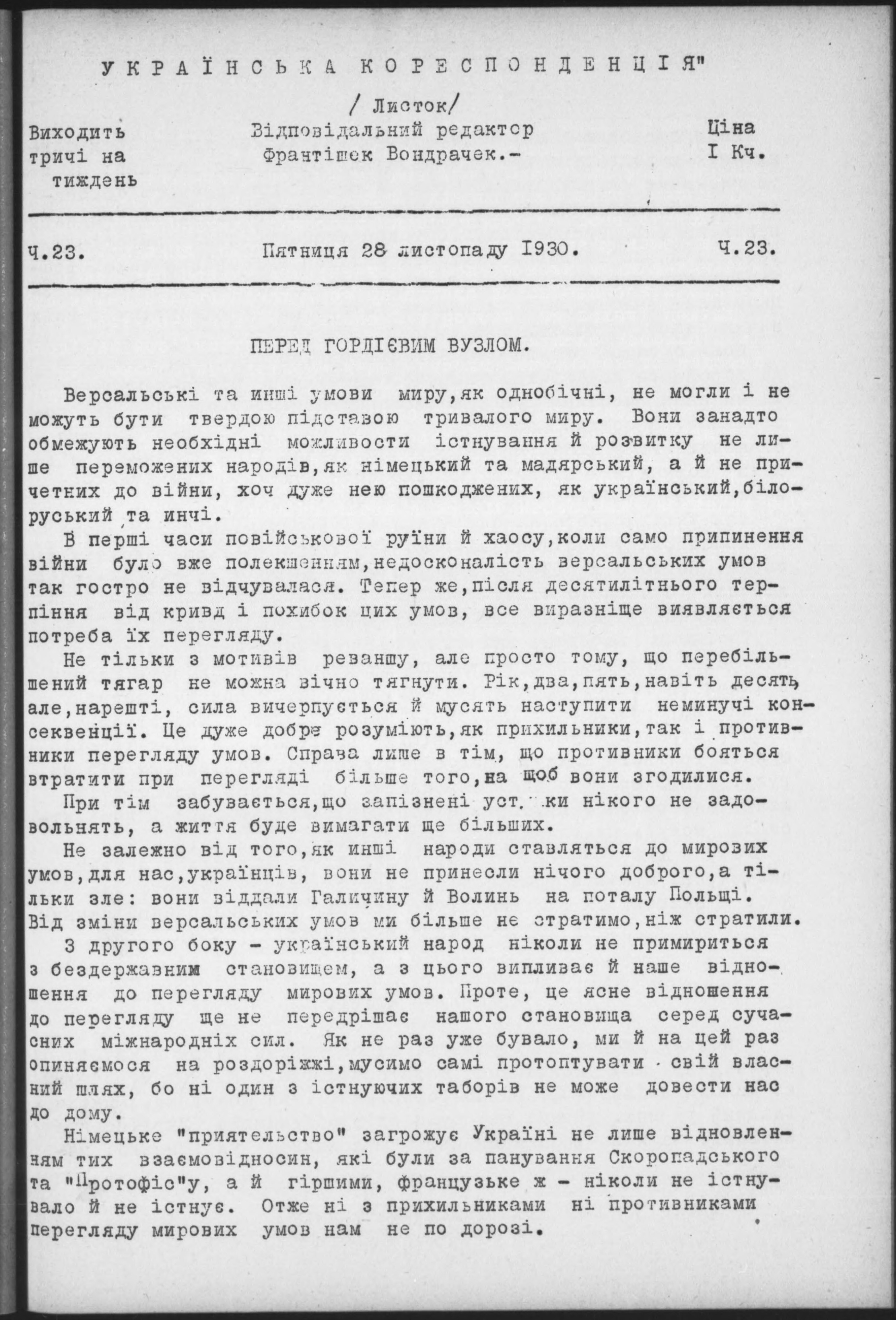 * Datum vydání výtisku: 28.11.1930 Číslo výtisku: 23