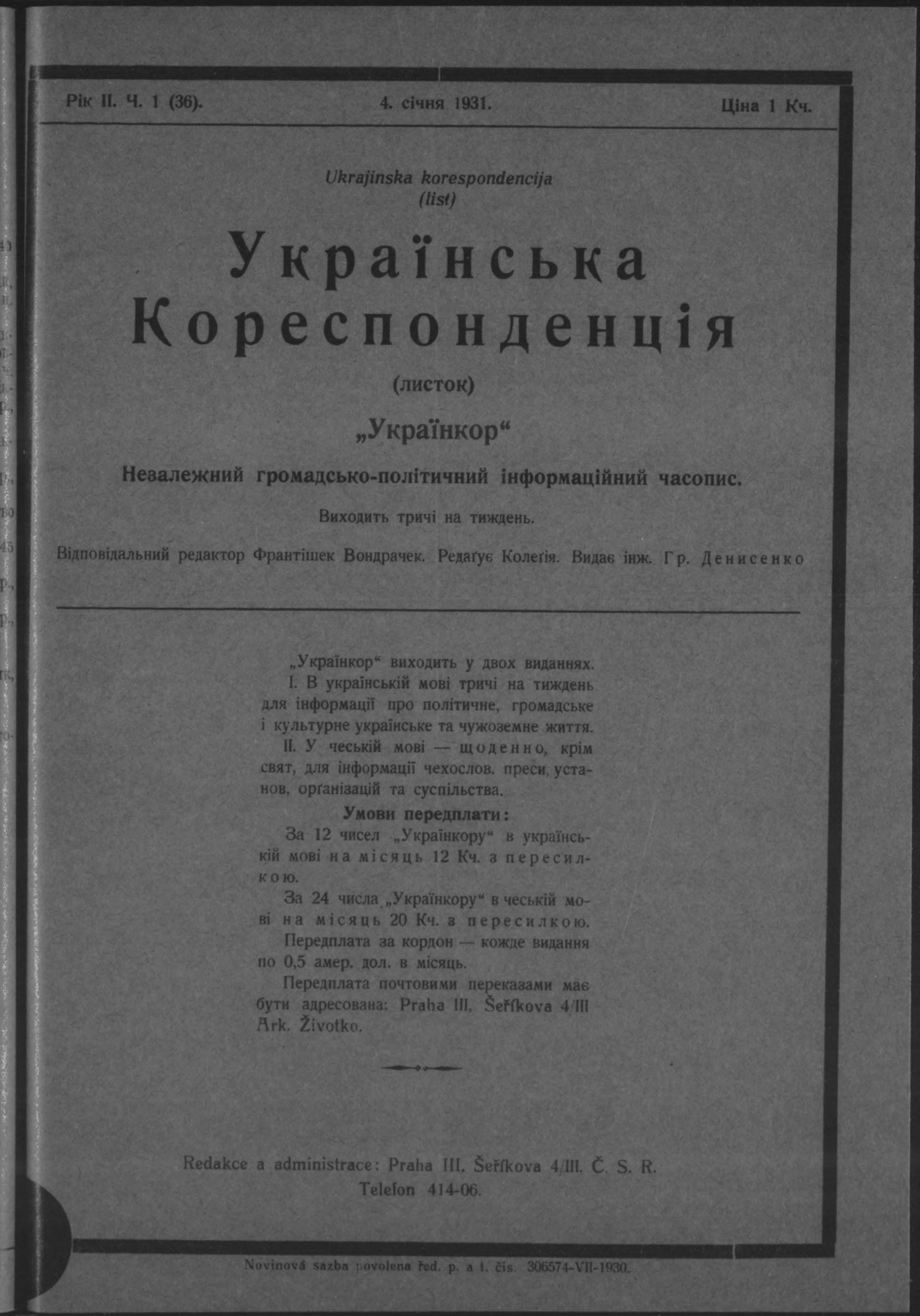 * Datum vydání výtisku: 4.1.1931 Číslo výtisku: 36