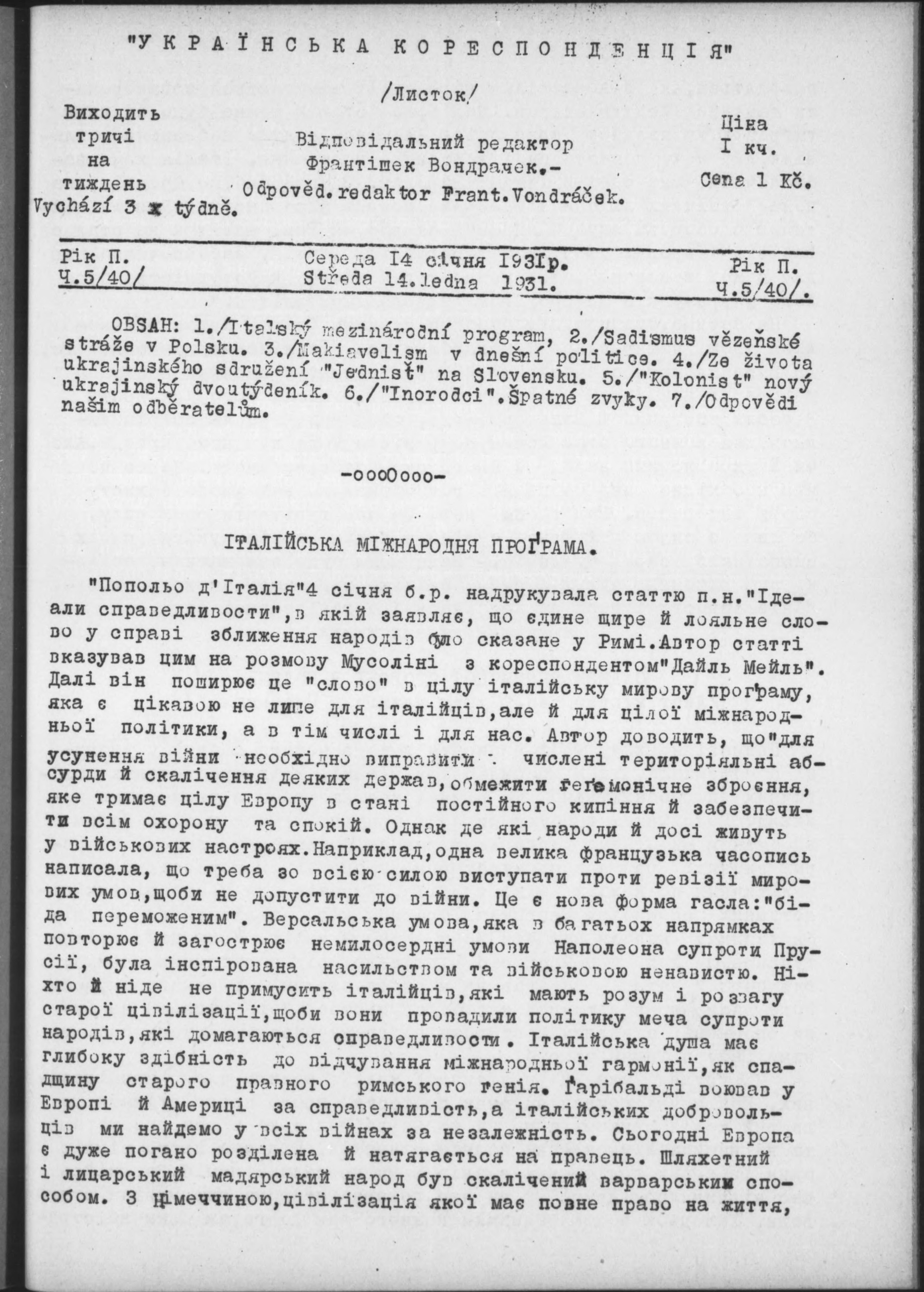 * Datum vydání výtisku: 14.1.1931 Číslo výtisku: 40