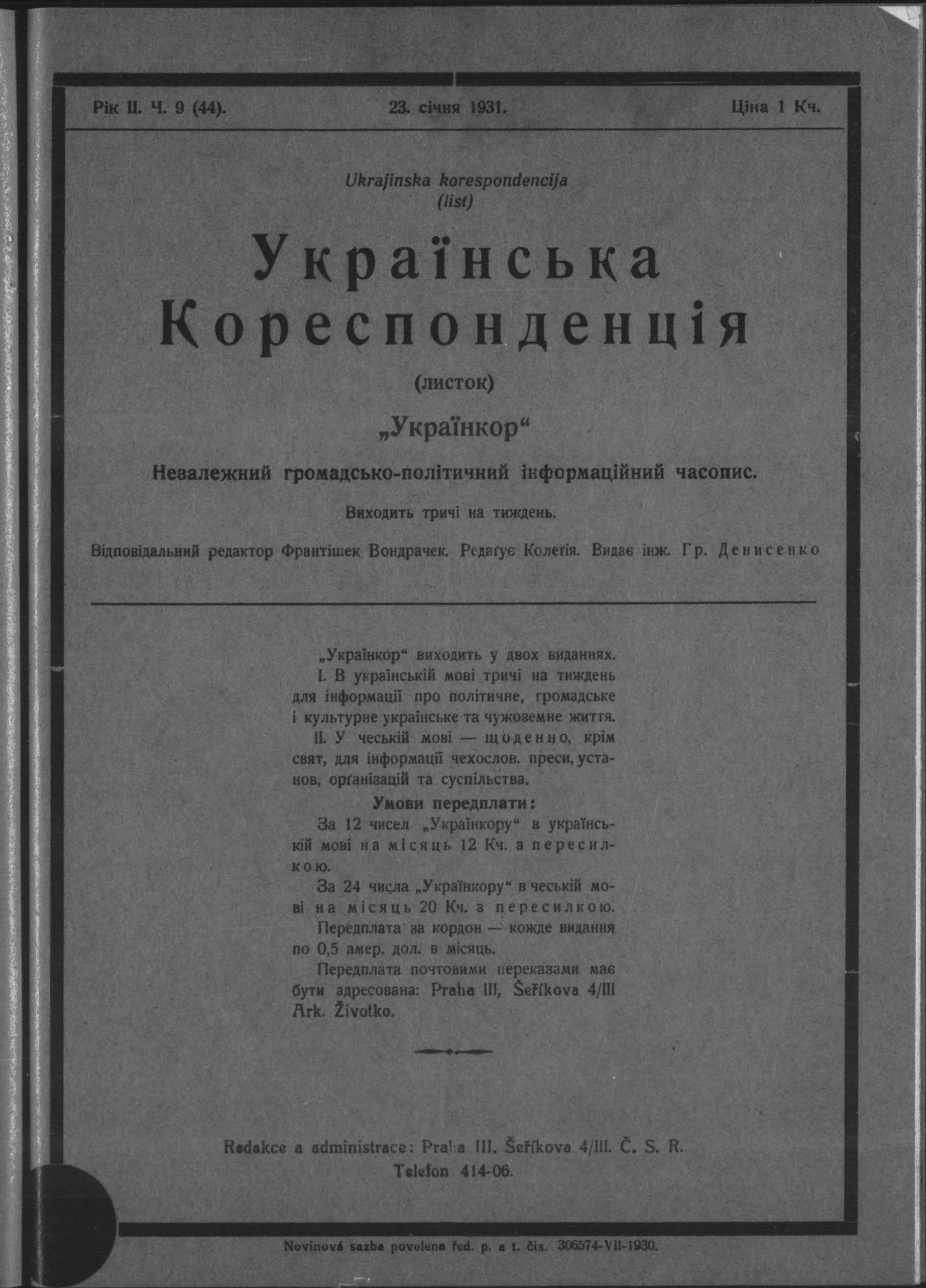 * Datum vydání výtisku: 23.1.1931 Číslo výtisku: 44