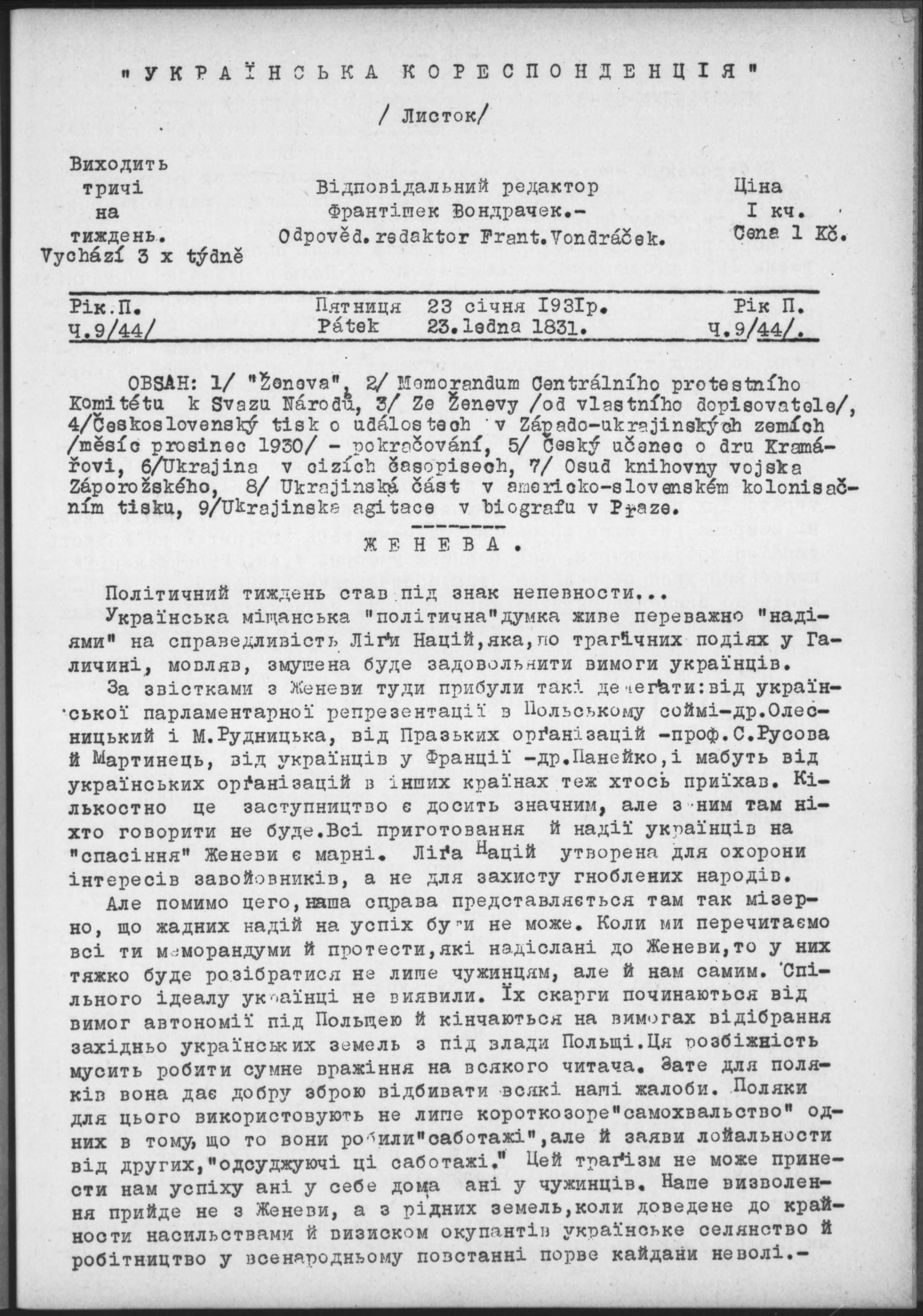 * Datum vydání výtisku: 23.1.1931 Číslo výtisku: 44