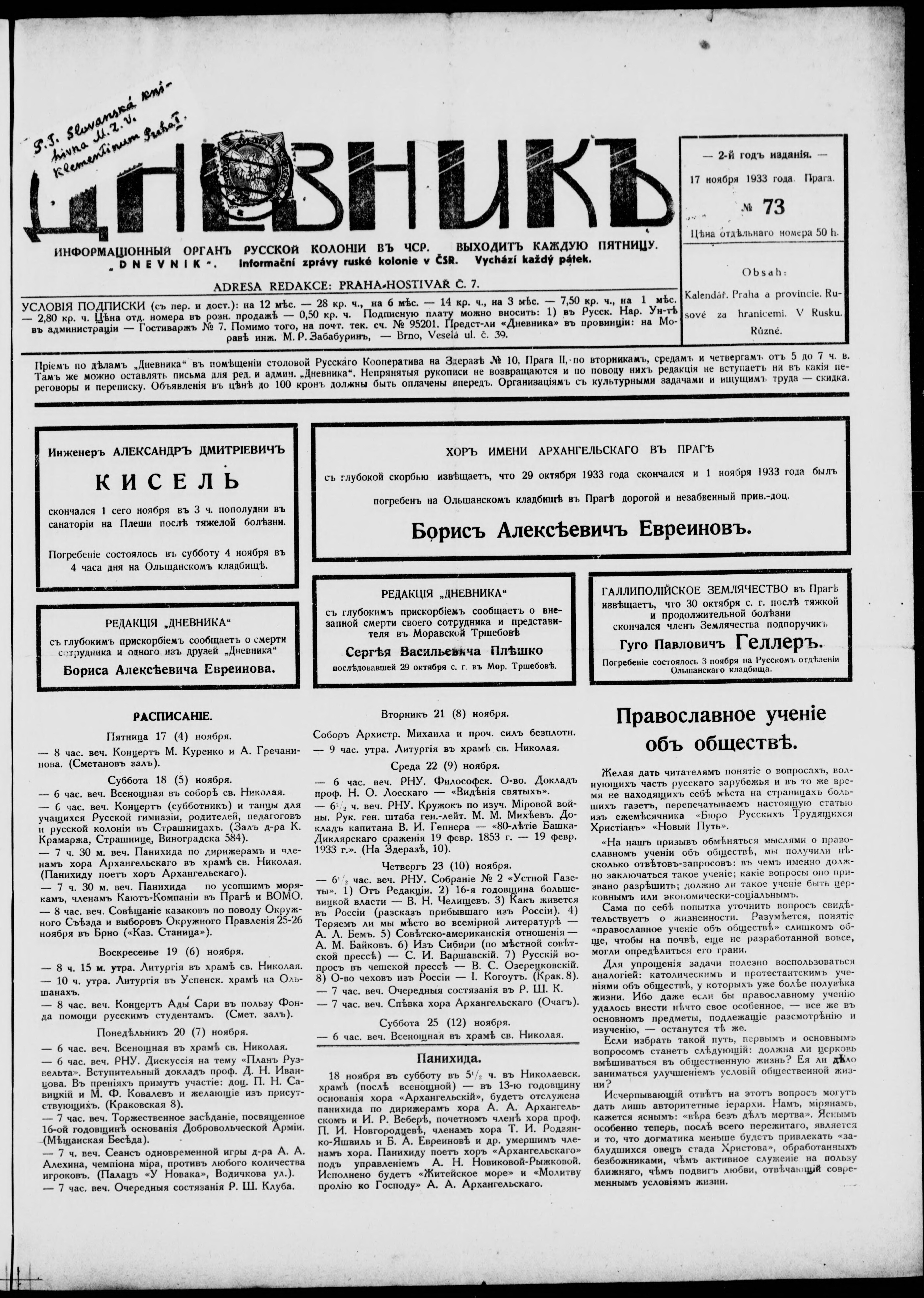 * Datum vydání výtisku: 17.11.1933 Číslo výtisku: 73