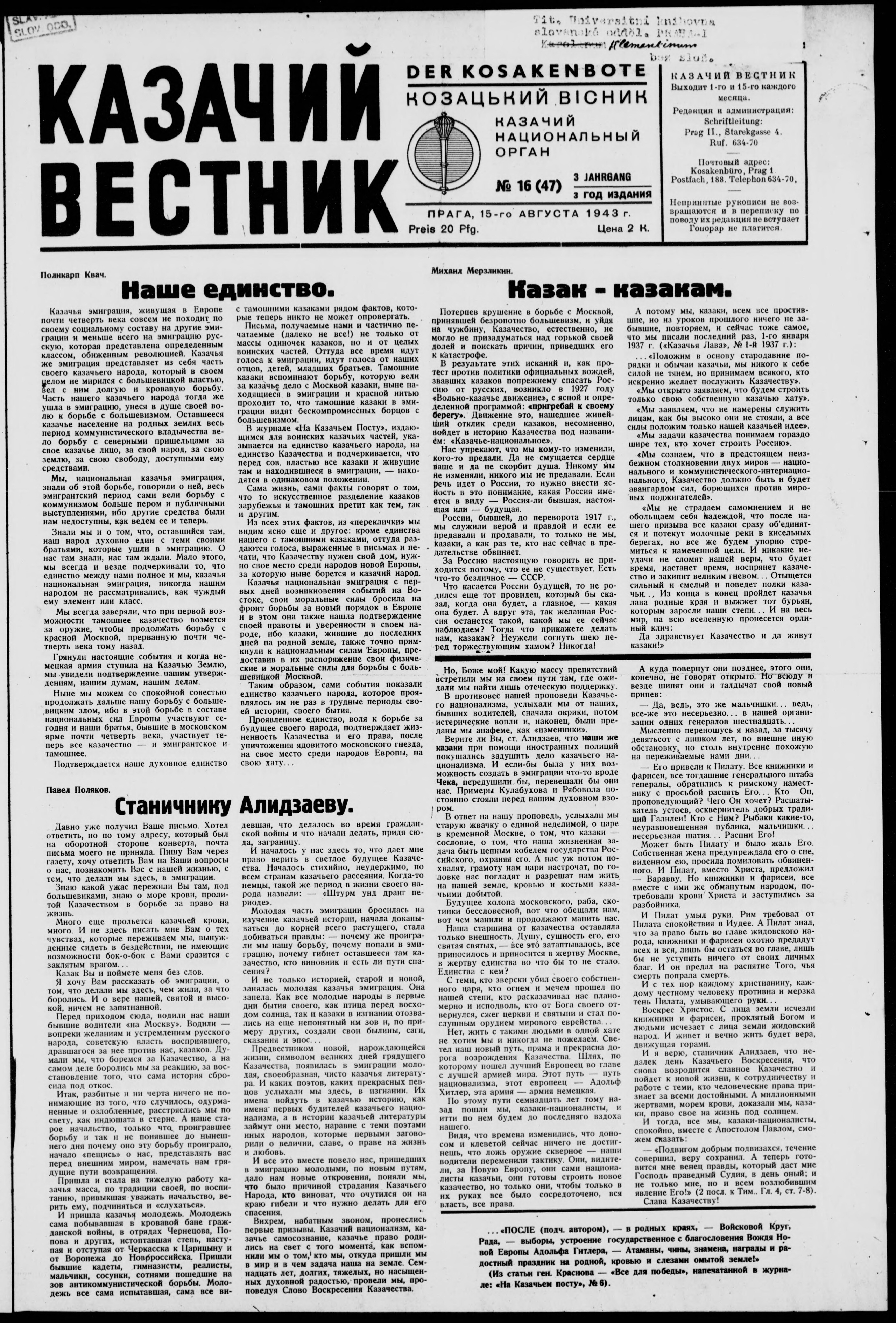 Kazachii vestnik = Kozácky věstník = Der Kosakenbote = Kozac'kyi visnyk
