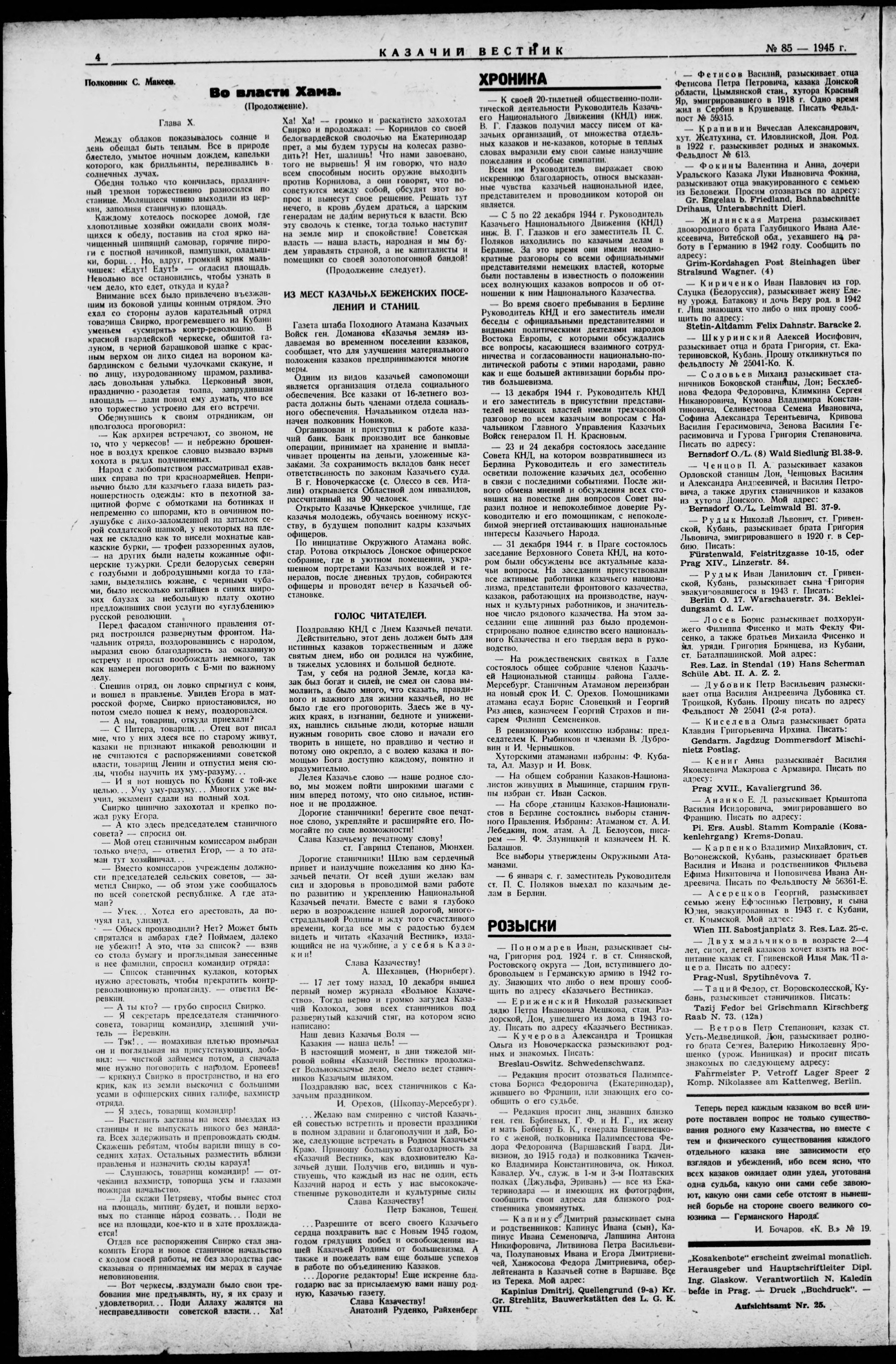 * Datum vydání výtisku: 15.1.1945 Číslo výtisku: 85
