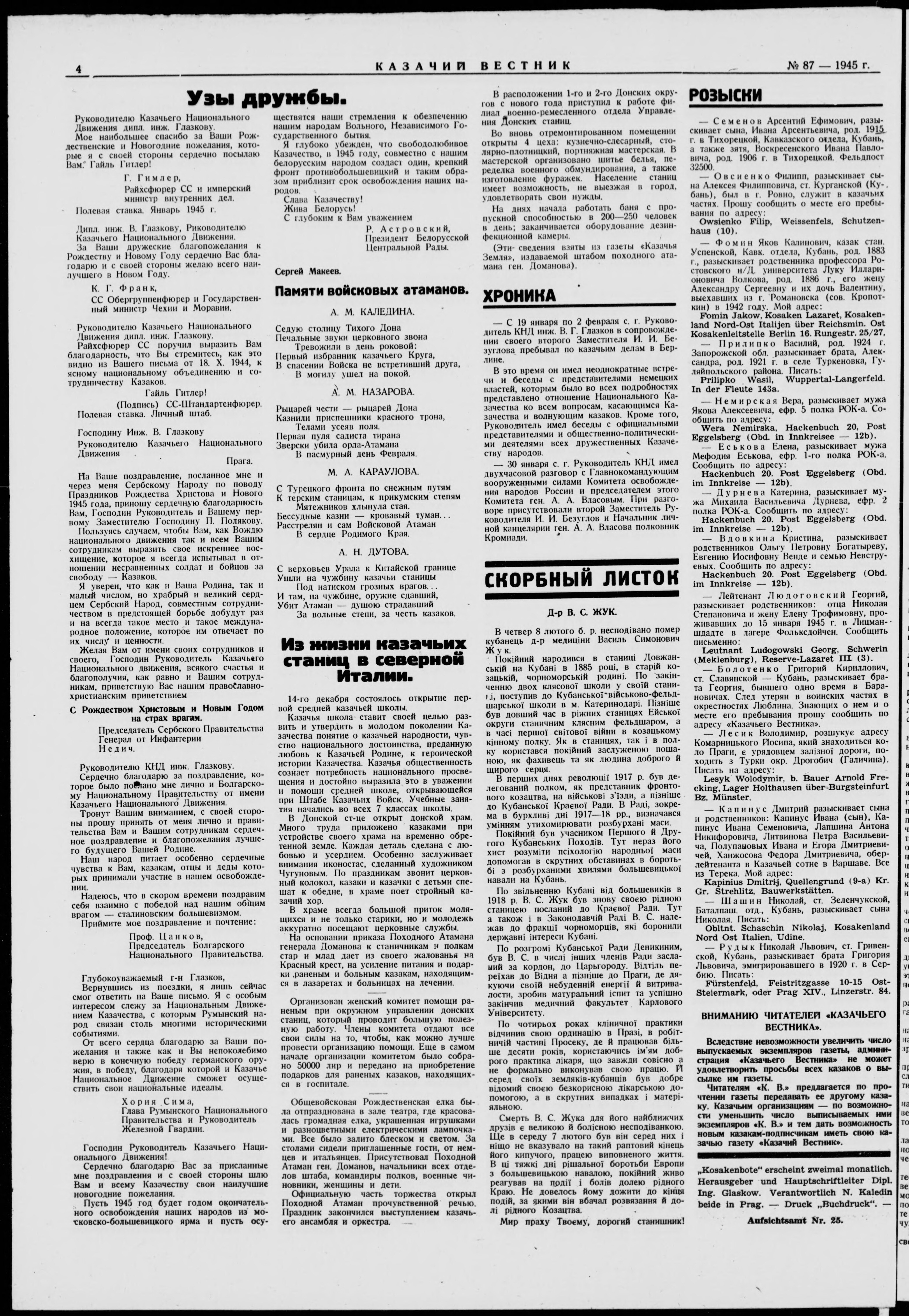 * Datum vydání výtisku: 15.2.1945 Číslo výtisku: 87