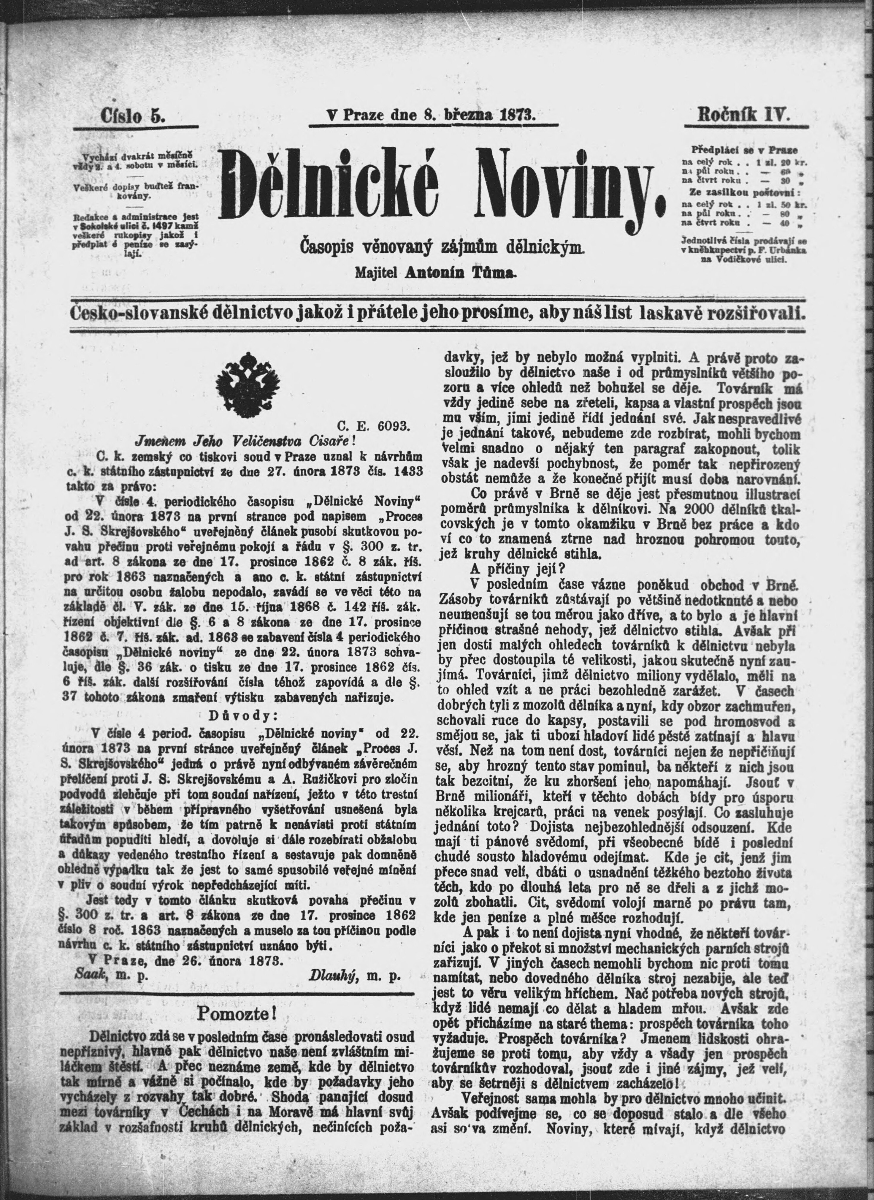 * Datum vydání výtisku: 8.3.1873 Číslo výtisku: 5