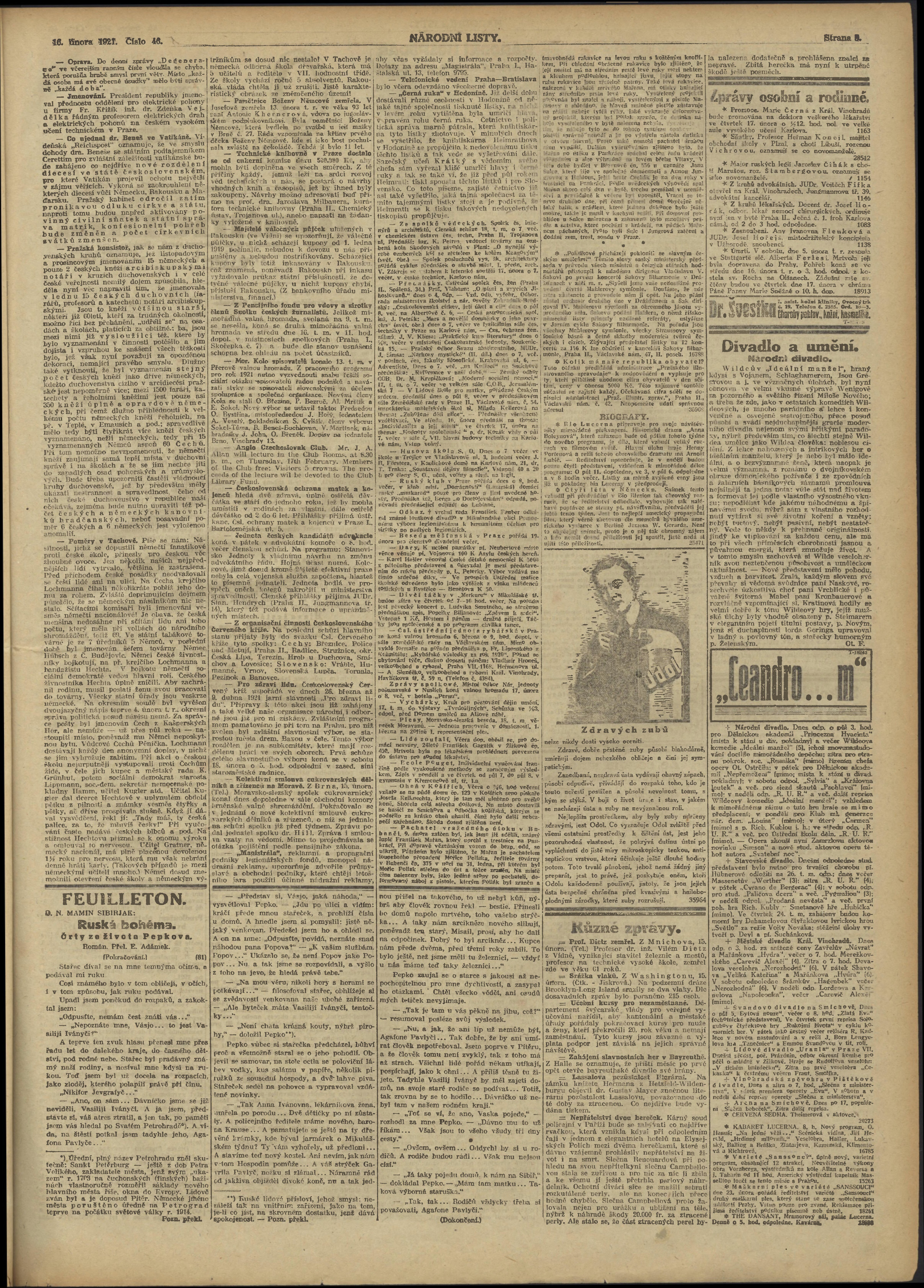* Datum vydání výtisku: 16.2.1921 Číslo výtisku: 46 Poznámky k výtisku: ranní vydání;