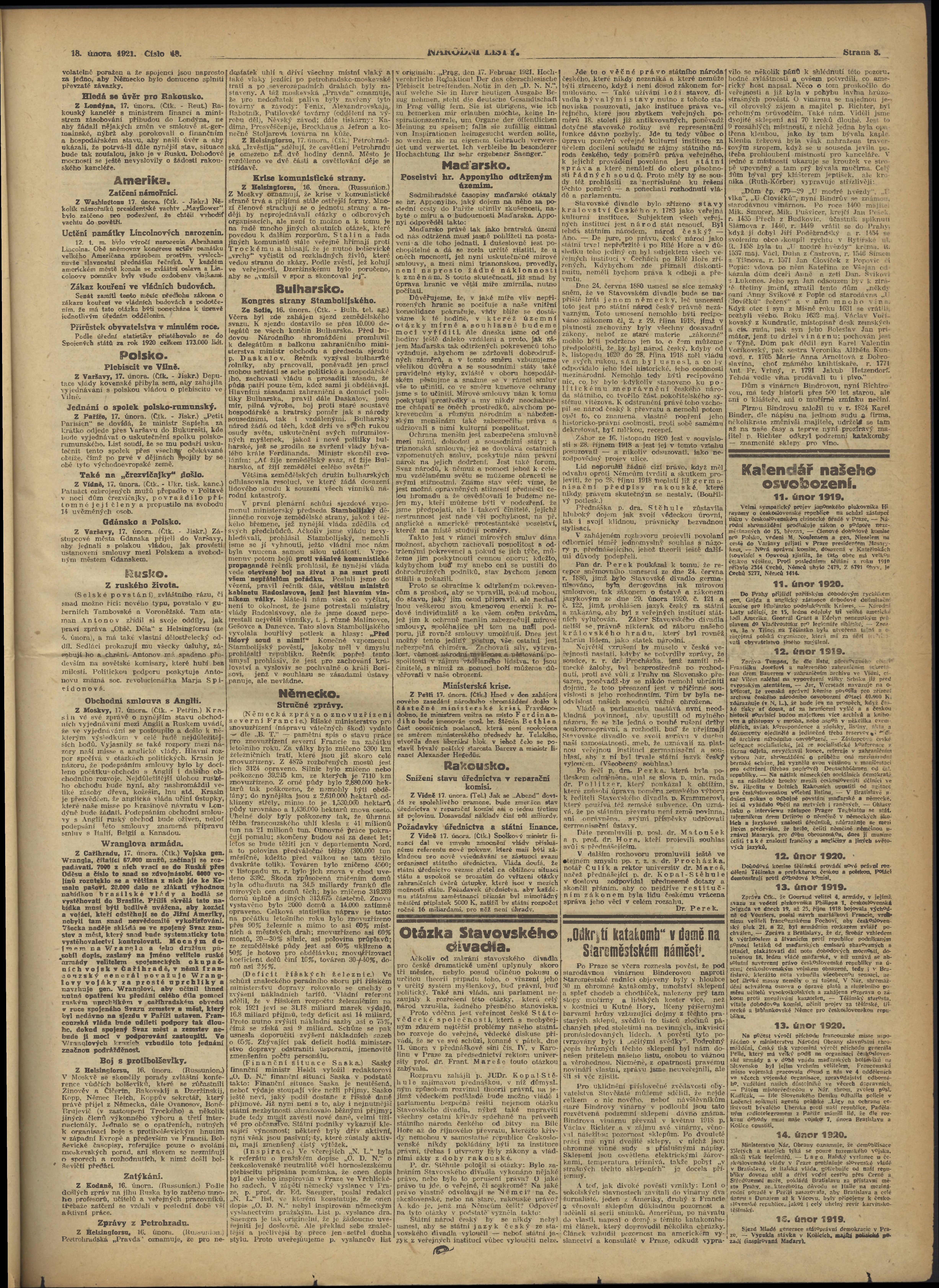 * Datum vydání výtisku: 18.2.1921 Číslo výtisku: 48 Poznámky k výtisku: ranní vydání;