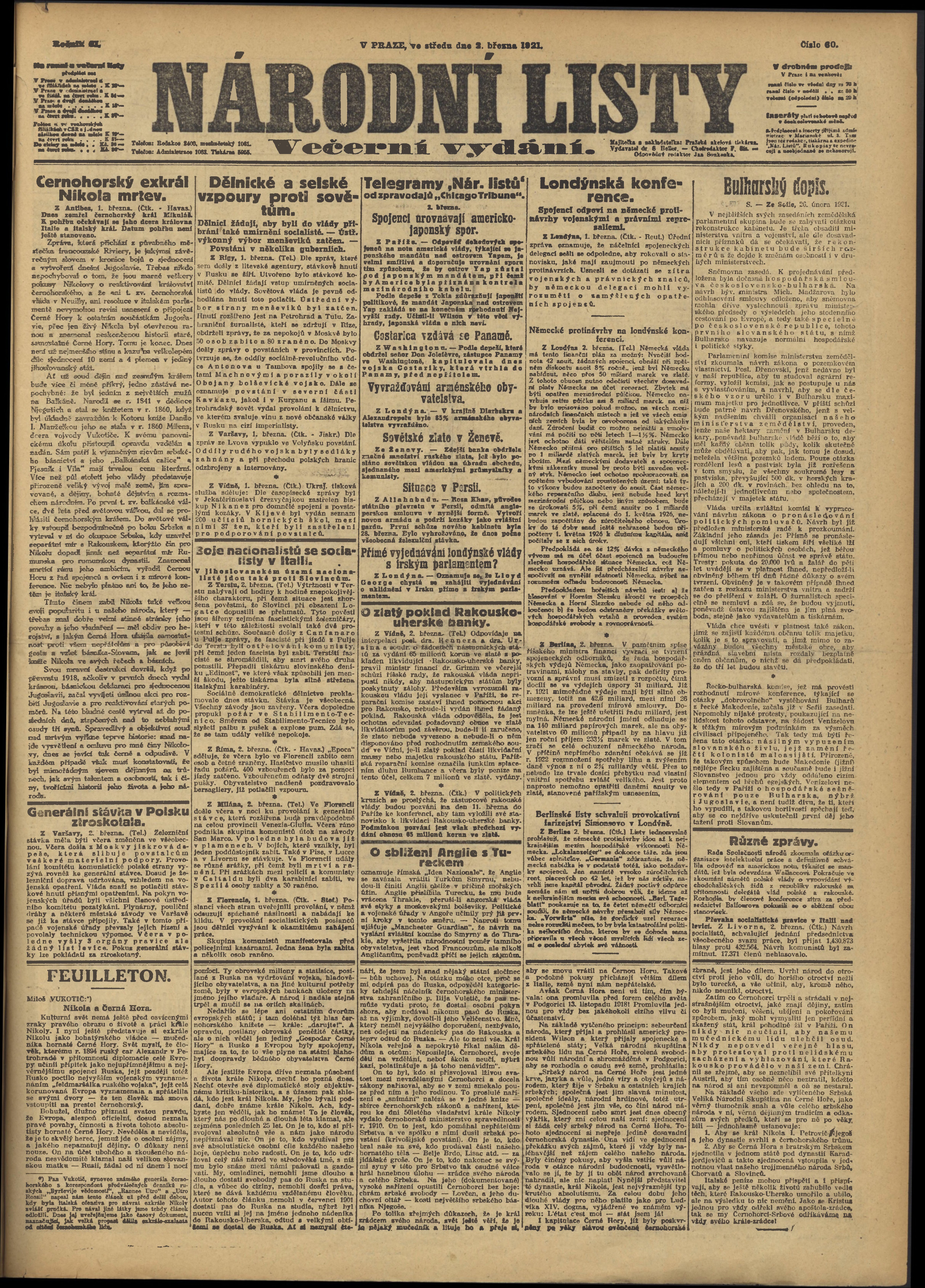 * Datum vydání výtisku: 2.3.1921 Číslo výtisku: 60 Poznámky k výtisku: večerní vydání;