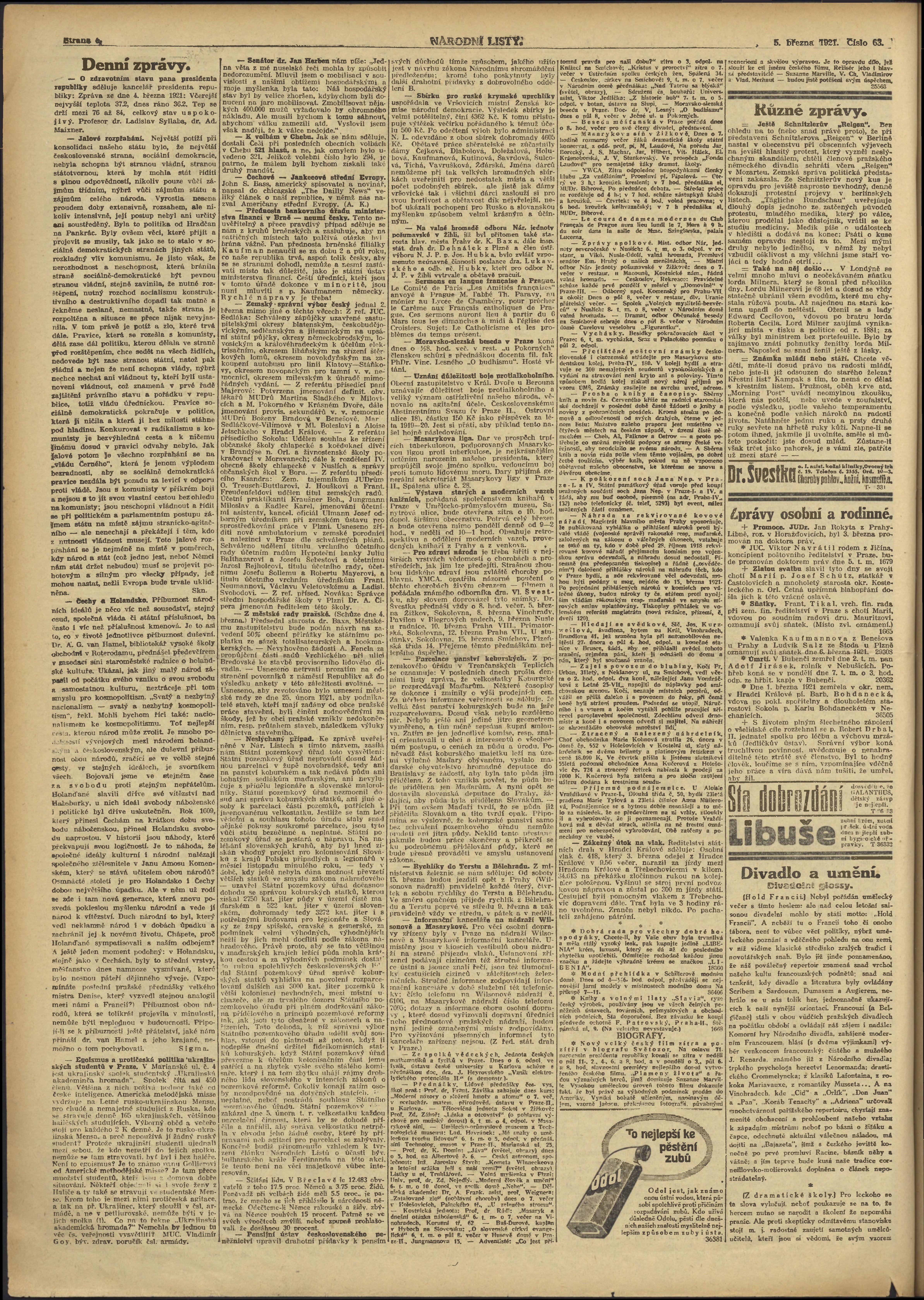 * Datum vydání výtisku: 5.3.1921 Číslo výtisku: 63 Poznámky k výtisku: ranní vydání;