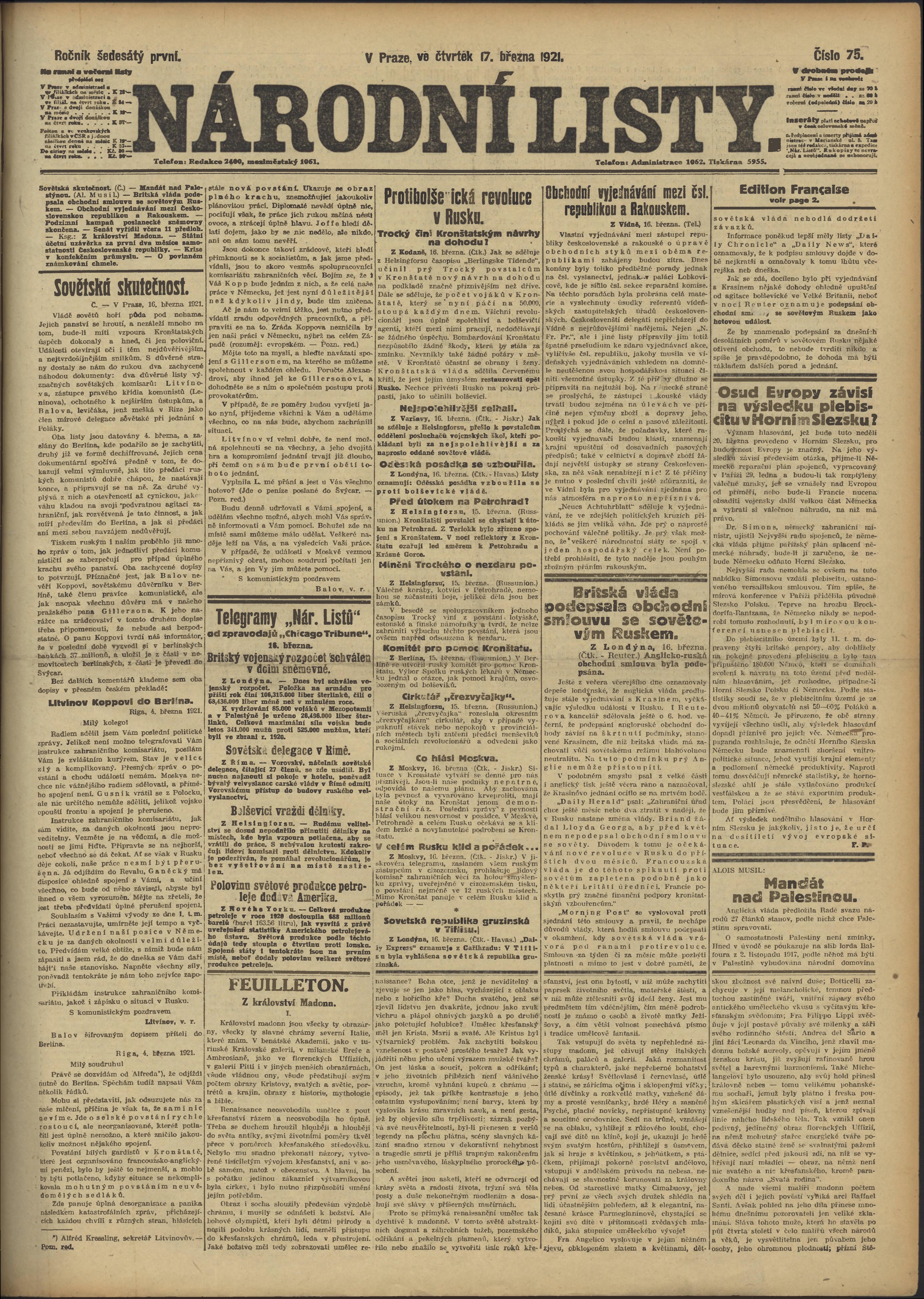 * Datum vydání výtisku: 17.3.1921 Číslo výtisku: 75 Poznámky k výtisku: ranní vydání;