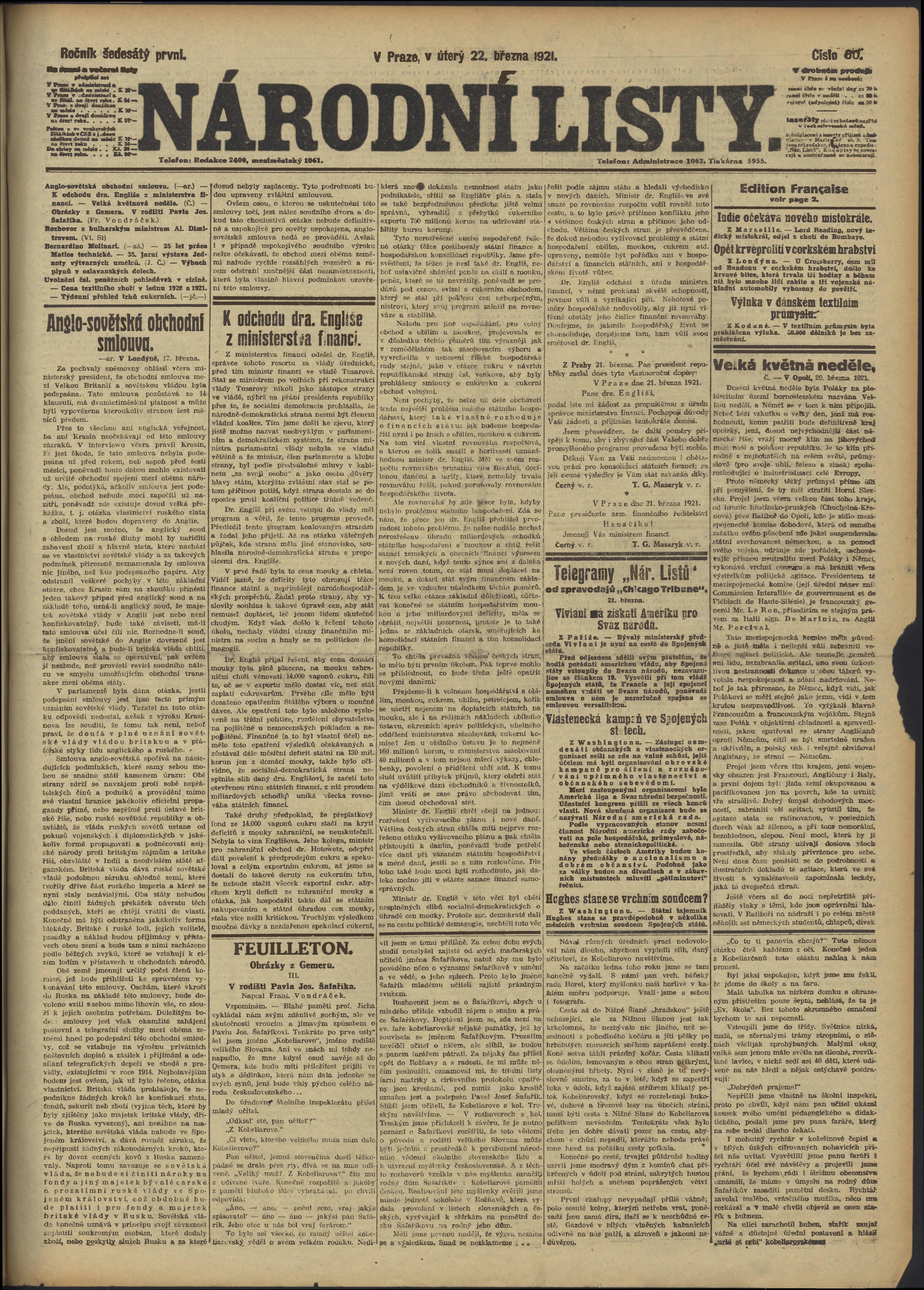 * Datum vydání výtisku: 22.3.1921 Číslo výtisku: 80 Poznámky k výtisku: ranní vydání;