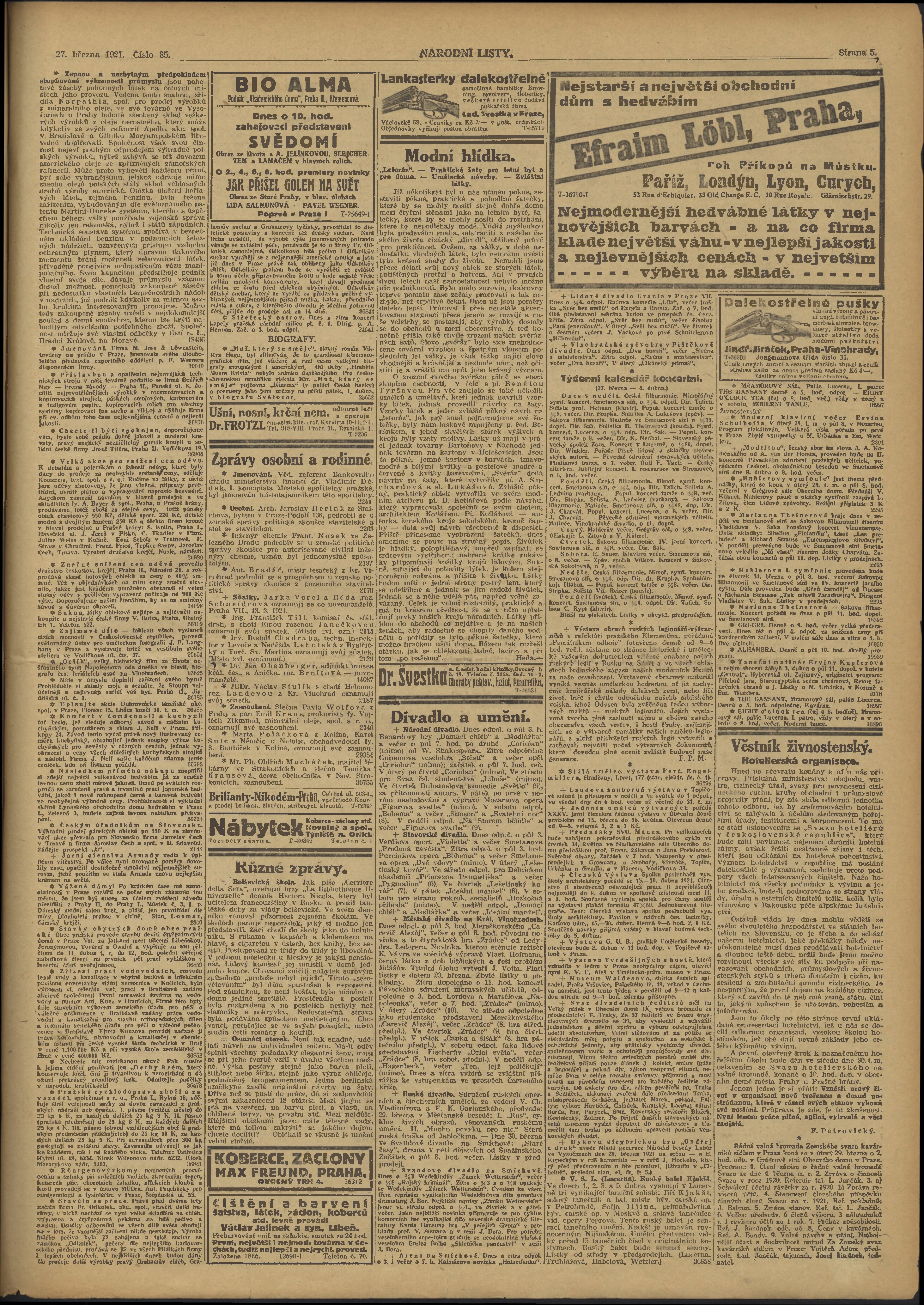 * Datum vydání výtisku: 27.3.1921 Číslo výtisku: 85 Poznámky k výtisku: ranní vydání;