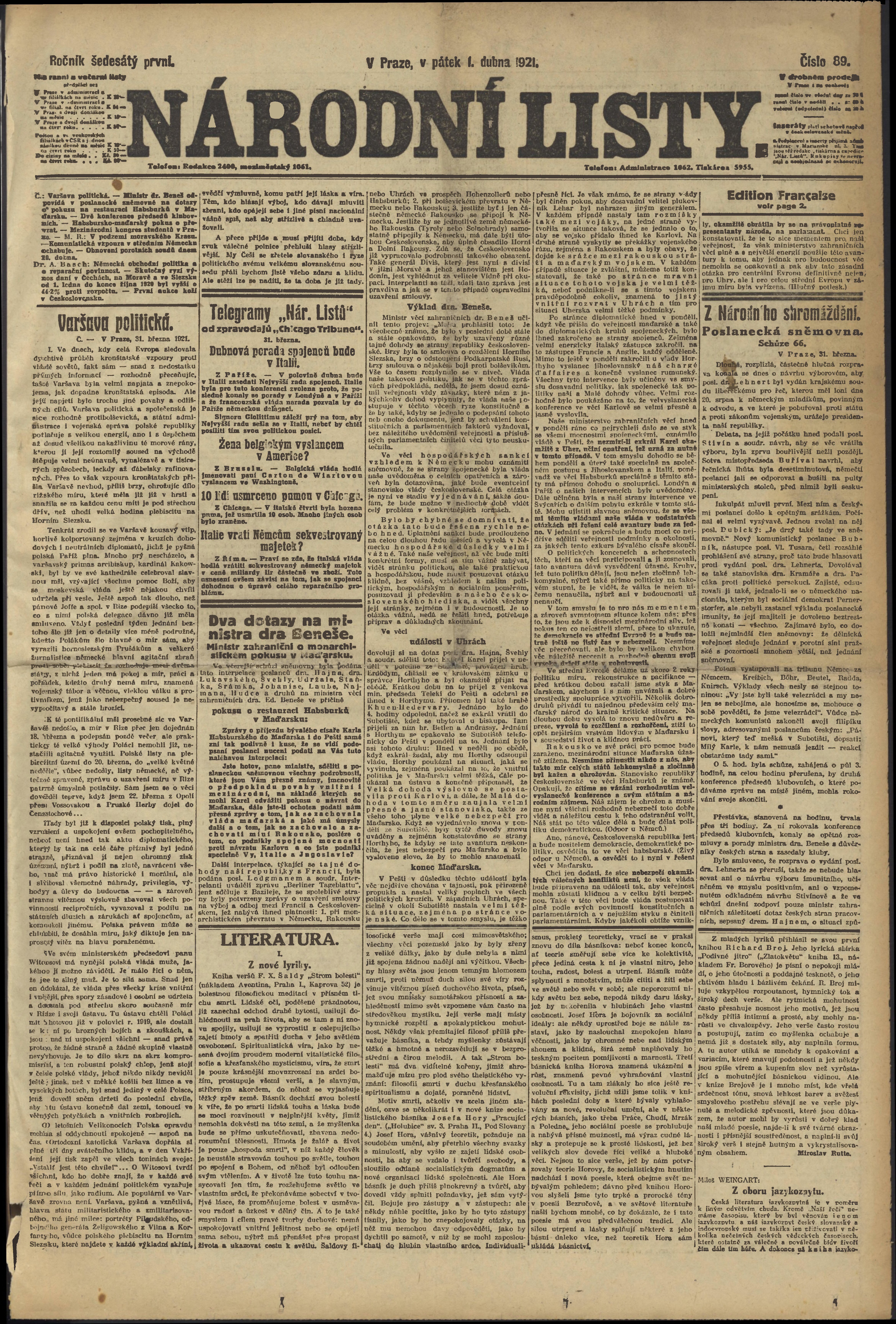 * Datum vydání výtisku: 1.4.1921 Číslo výtisku: 89 Poznámky k výtisku: ranní vydání;