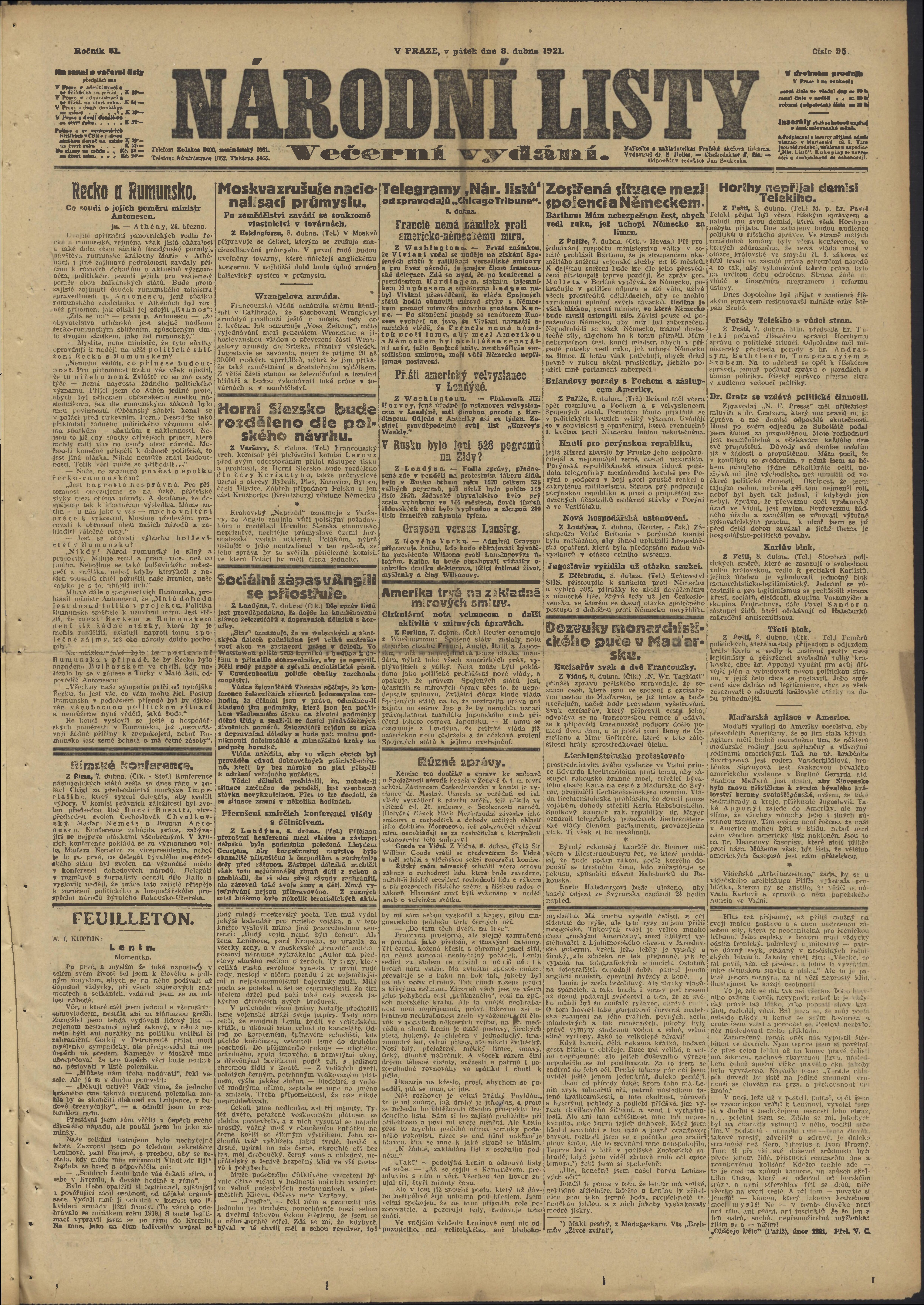 * Datum vydání výtisku: 8.4.1921 Číslo výtisku: 95 Poznámky k výtisku: večerní vydání;