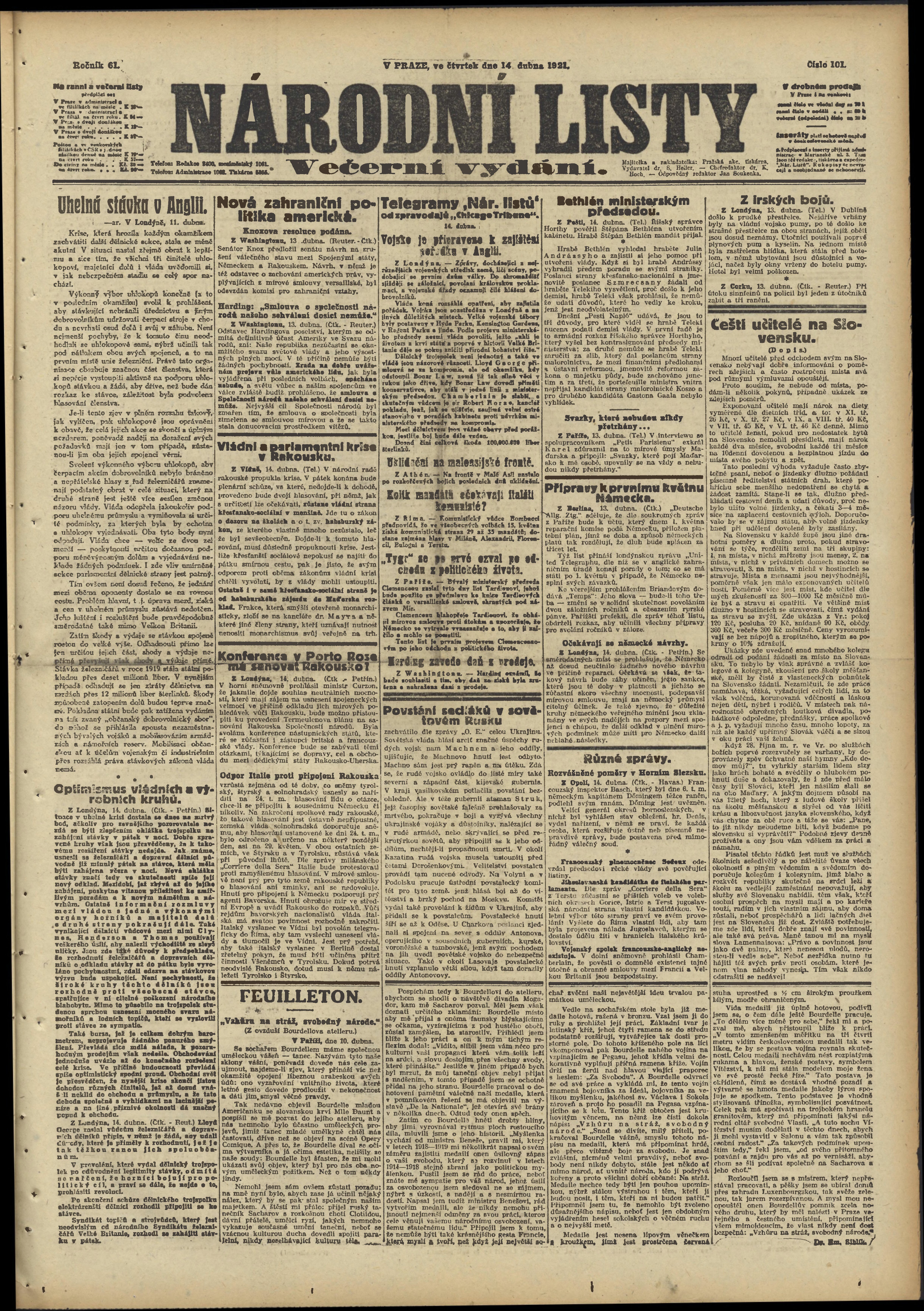 * Datum vydání výtisku: 14.4.1921 Číslo výtisku: 101 Poznámky k výtisku: večerní vydání;
