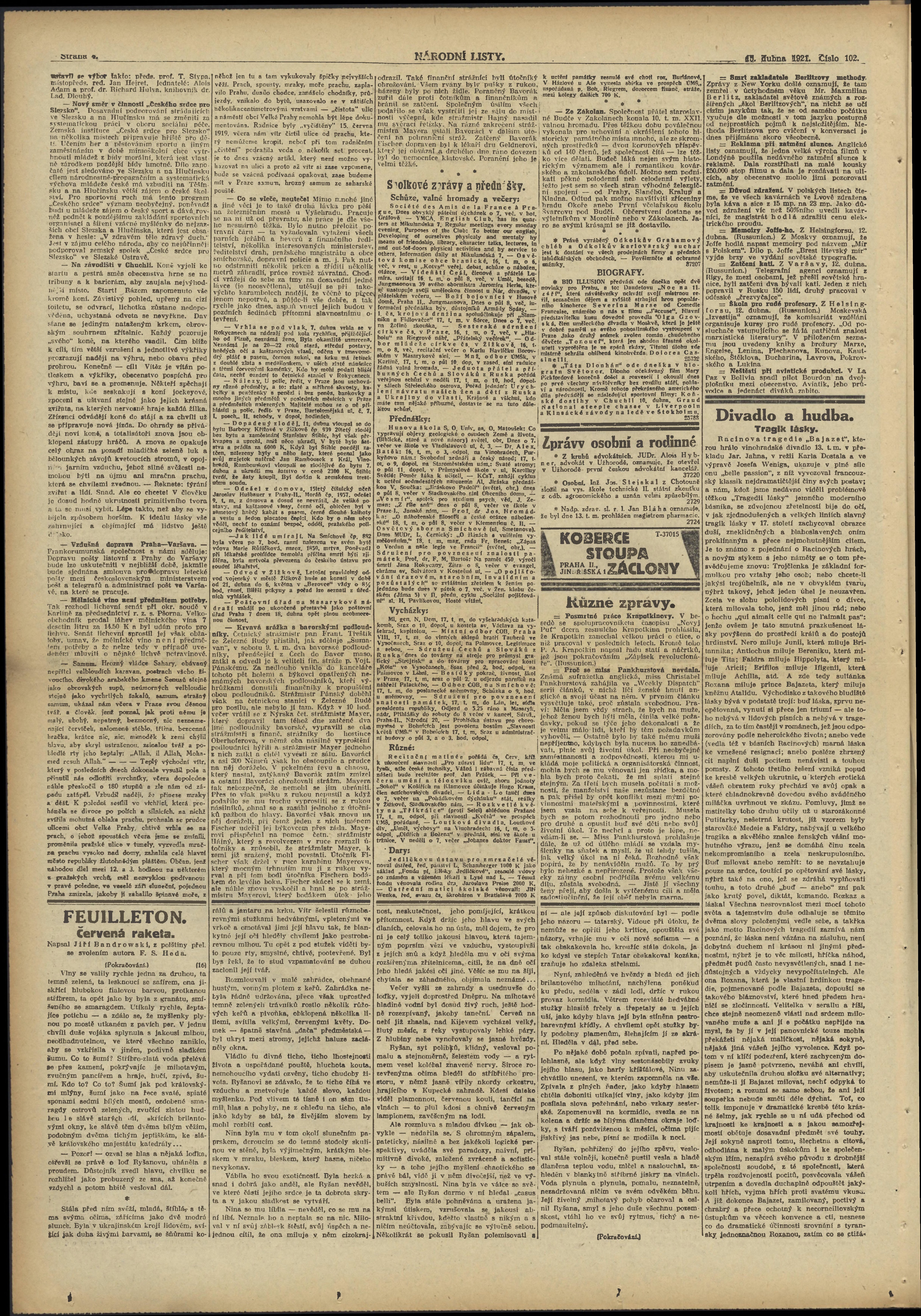 * Datum vydání výtisku: 15.4.1921 Číslo výtisku: 102 Poznámky k výtisku: ranní vydání;