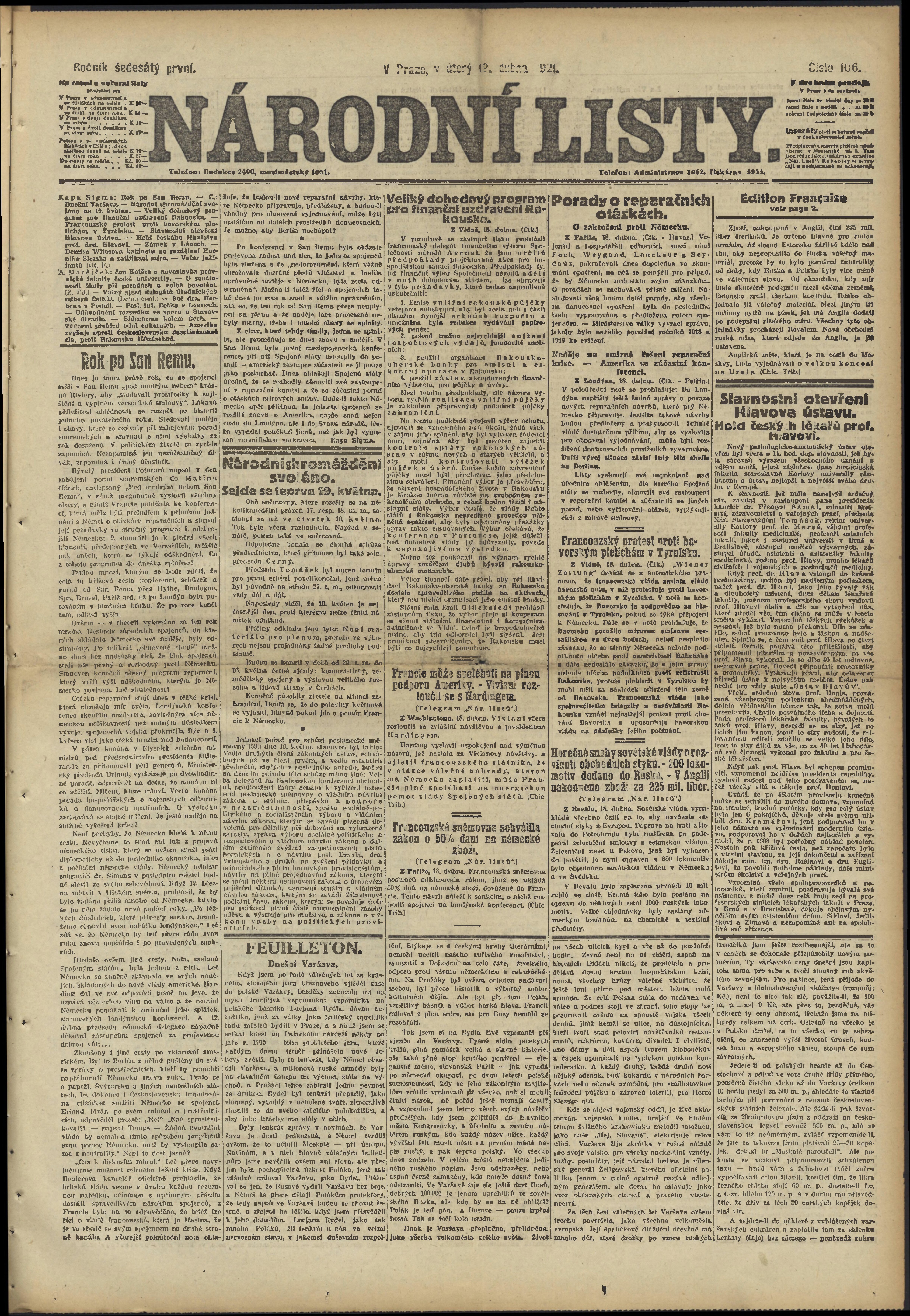 * Datum vydání výtisku: 19.4.1921 Číslo výtisku: 106 Poznámky k výtisku: ranní vydání;