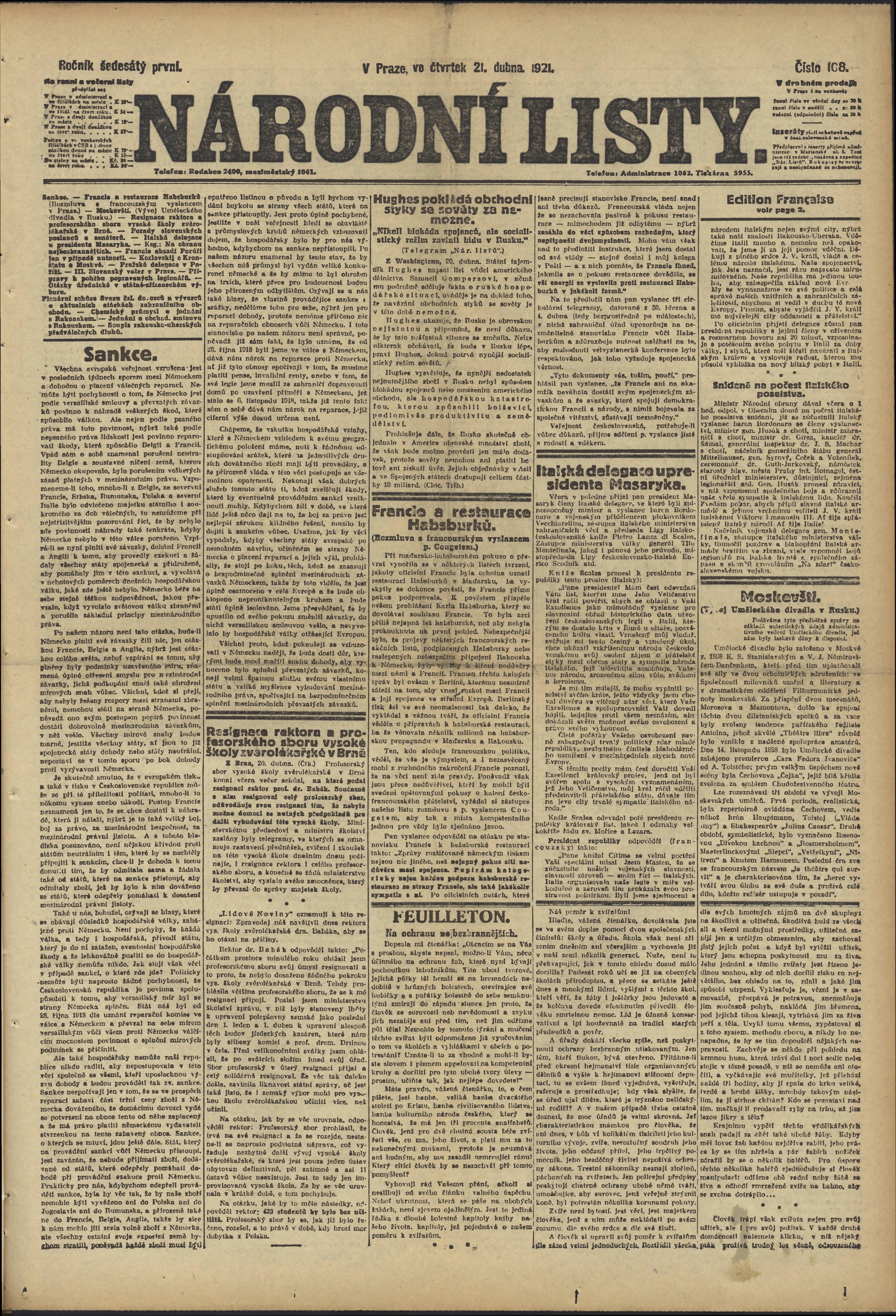 * Datum vydání výtisku: 21.4.1921 Číslo výtisku: 108 Poznámky k výtisku: ranní vydání;