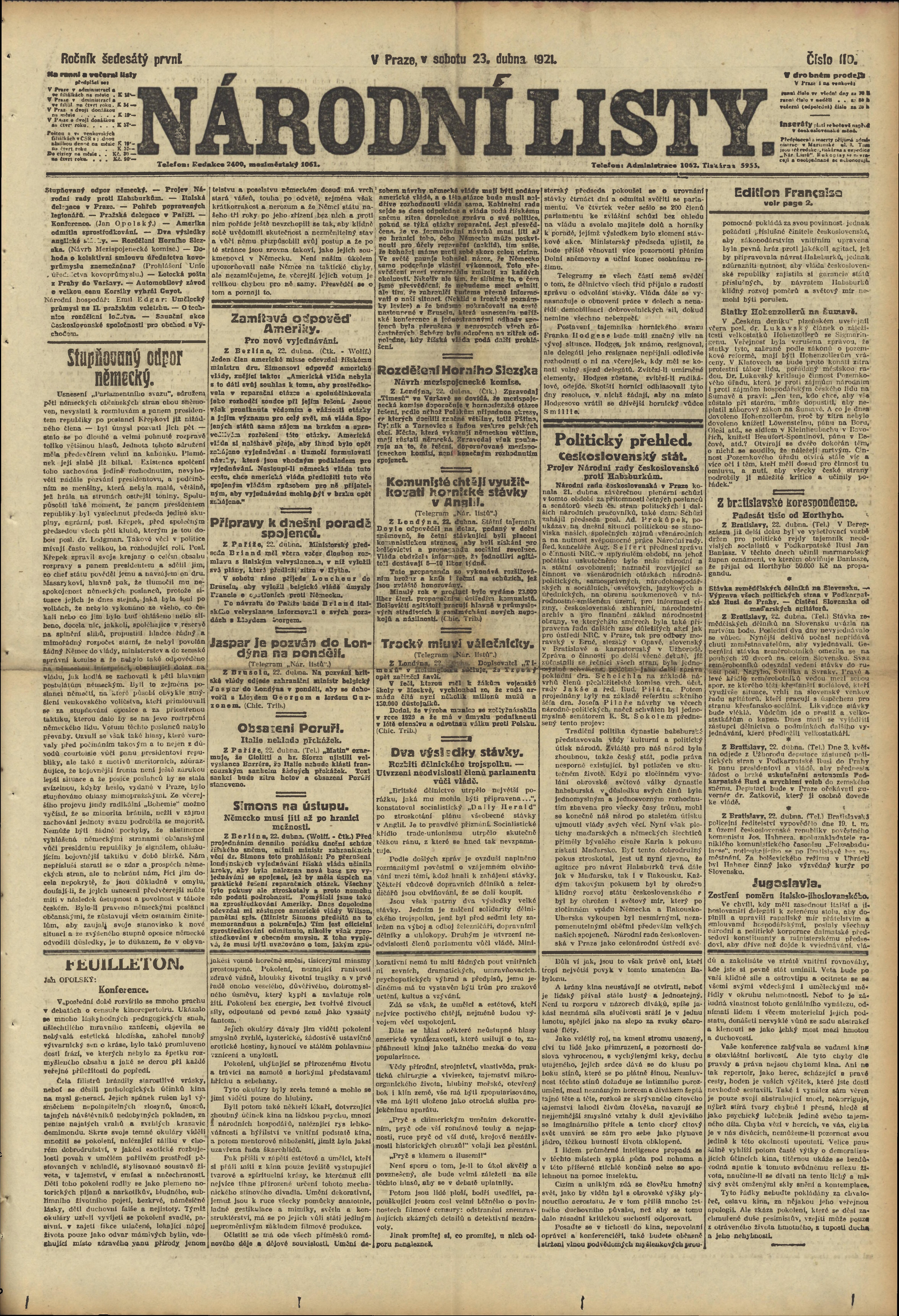 * Datum vydání výtisku: 23.4.1921 Číslo výtisku: 110 Poznámky k výtisku: ranní vydání;