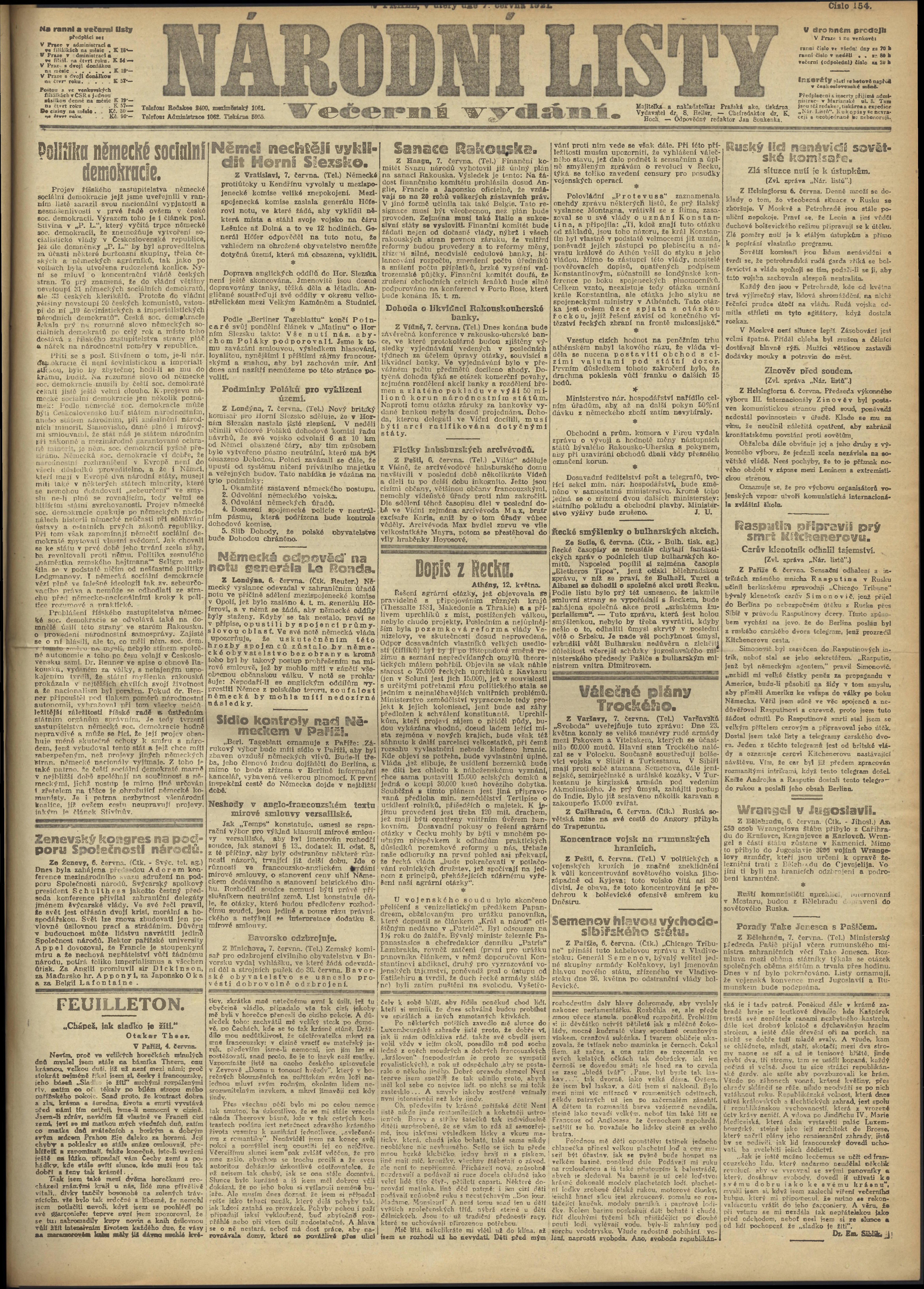 * Datum vydání výtisku: 7.6.1921 Číslo výtisku: 154 Poznámky k výtisku: večerní vydání;