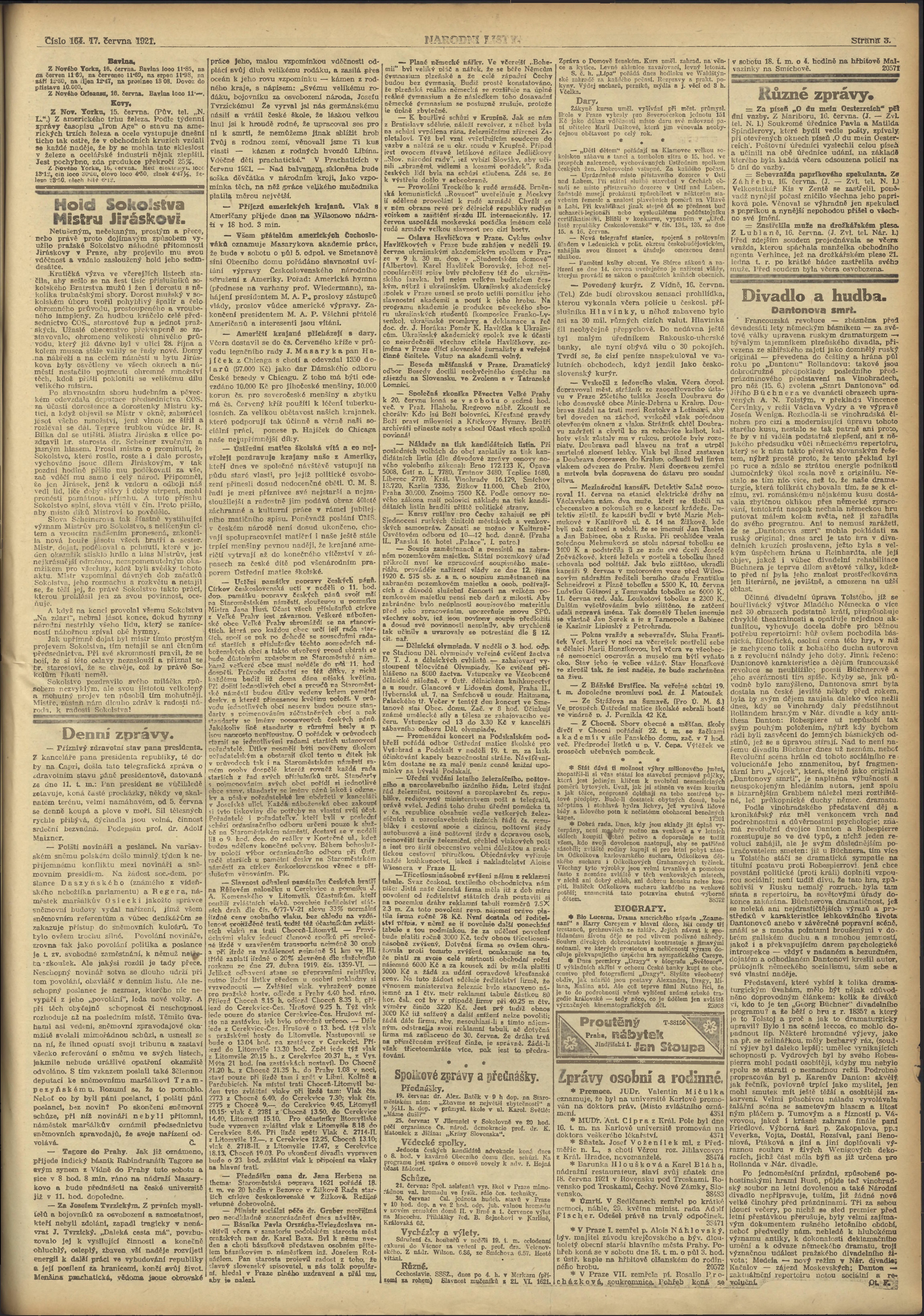 * Datum vydání výtisku: 17.6.1921 Číslo výtisku: 164 Poznámky k výtisku: ranní vydání;