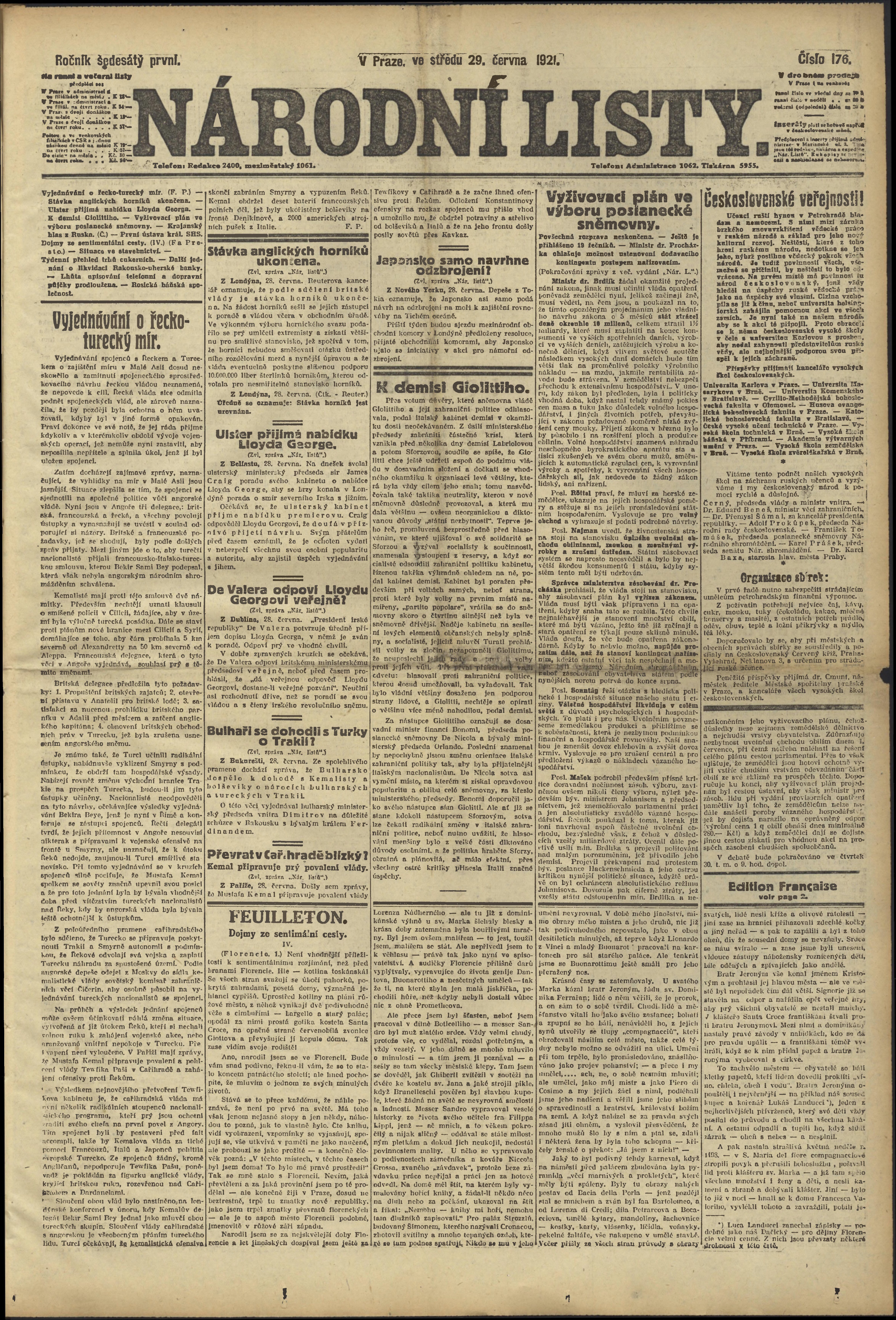 * Datum vydání výtisku: 29.6.1921 Číslo výtisku: 176 Poznámky k výtisku: ranní vydání;