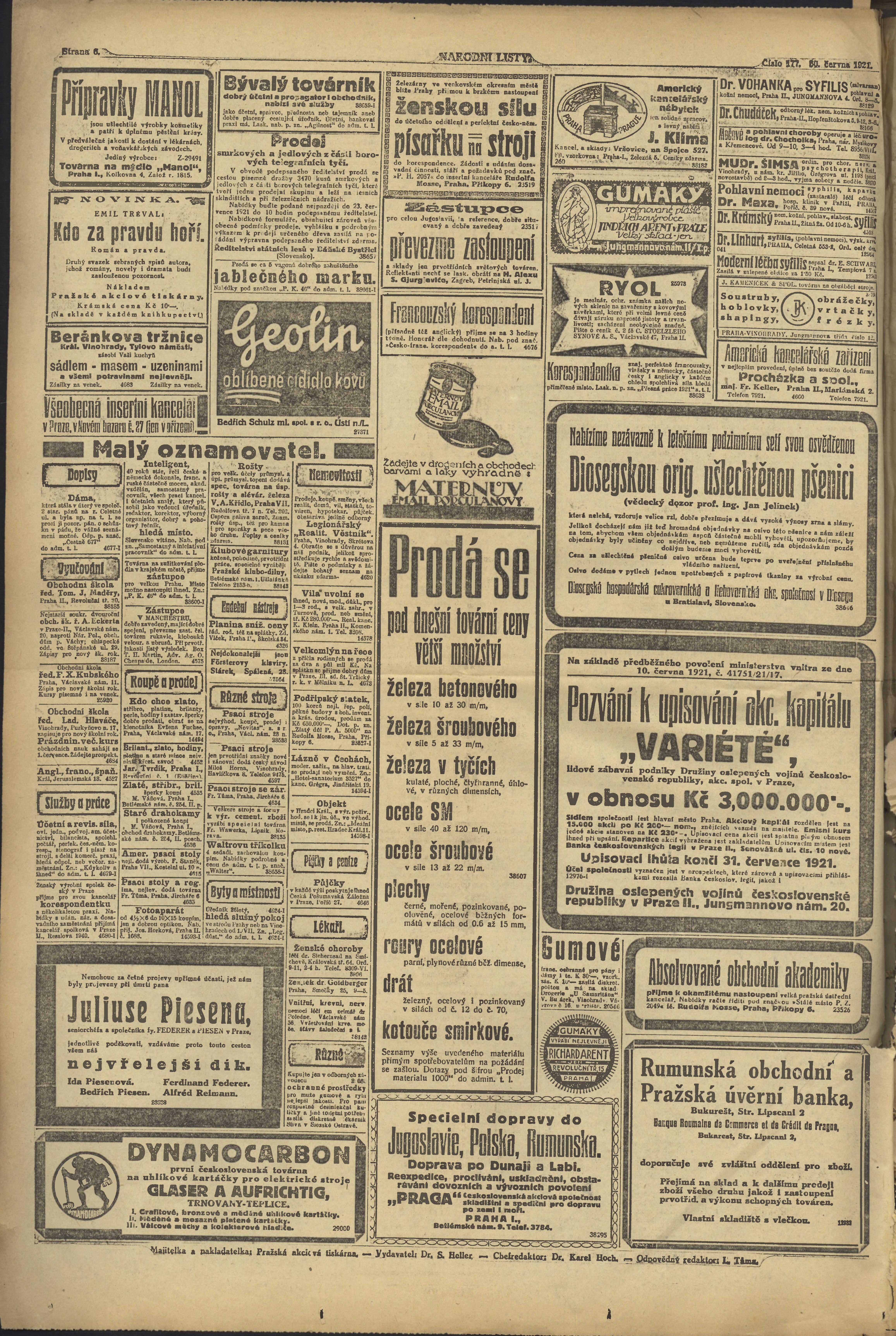 * Datum vydání výtisku: 30.6.1921 Číslo výtisku: 177 Poznámky k výtisku: ranní vydání;