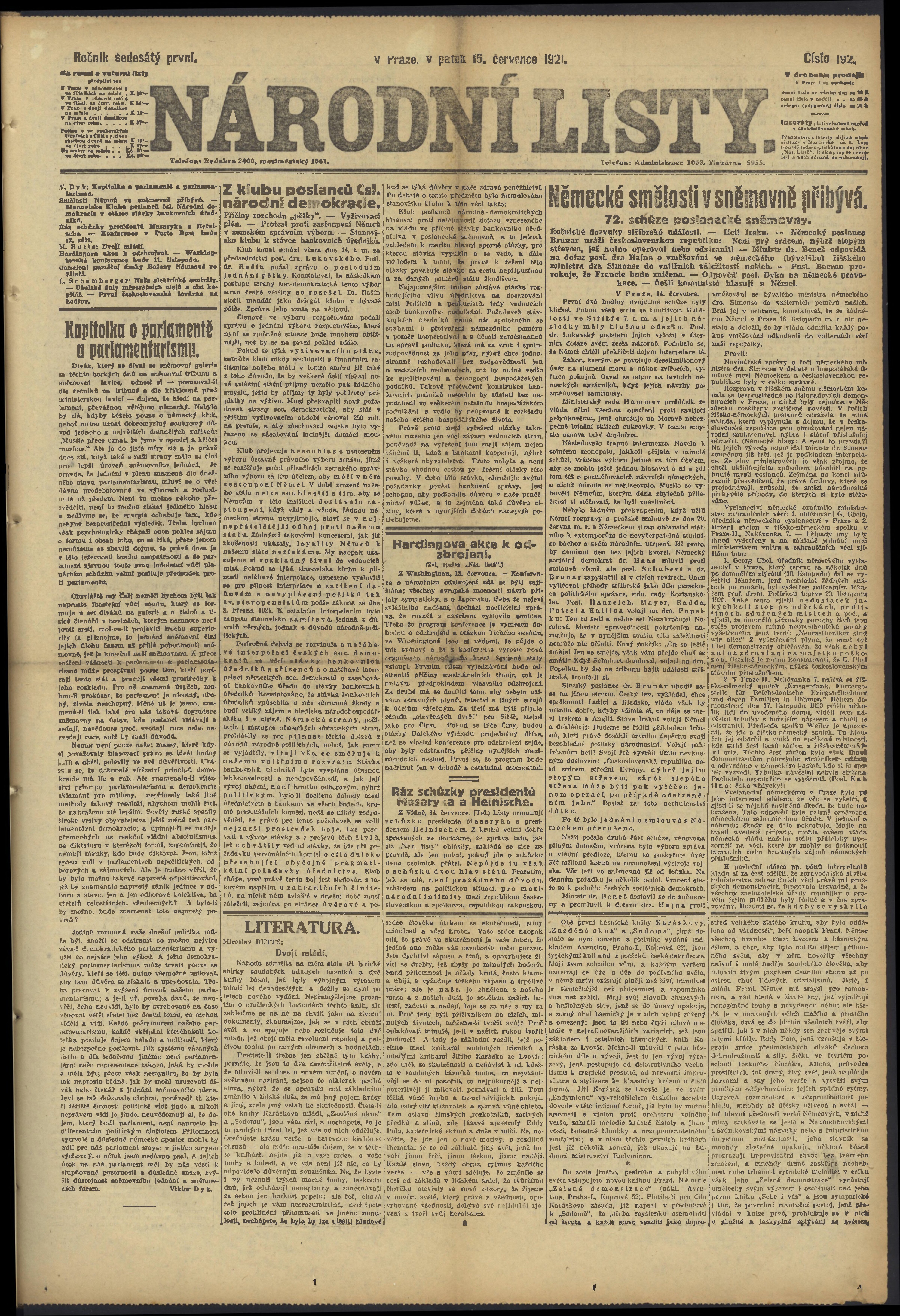 * Datum vydání výtisku: 15.7.1921 Číslo výtisku: 192 Poznámky k výtisku: ranní vydání;