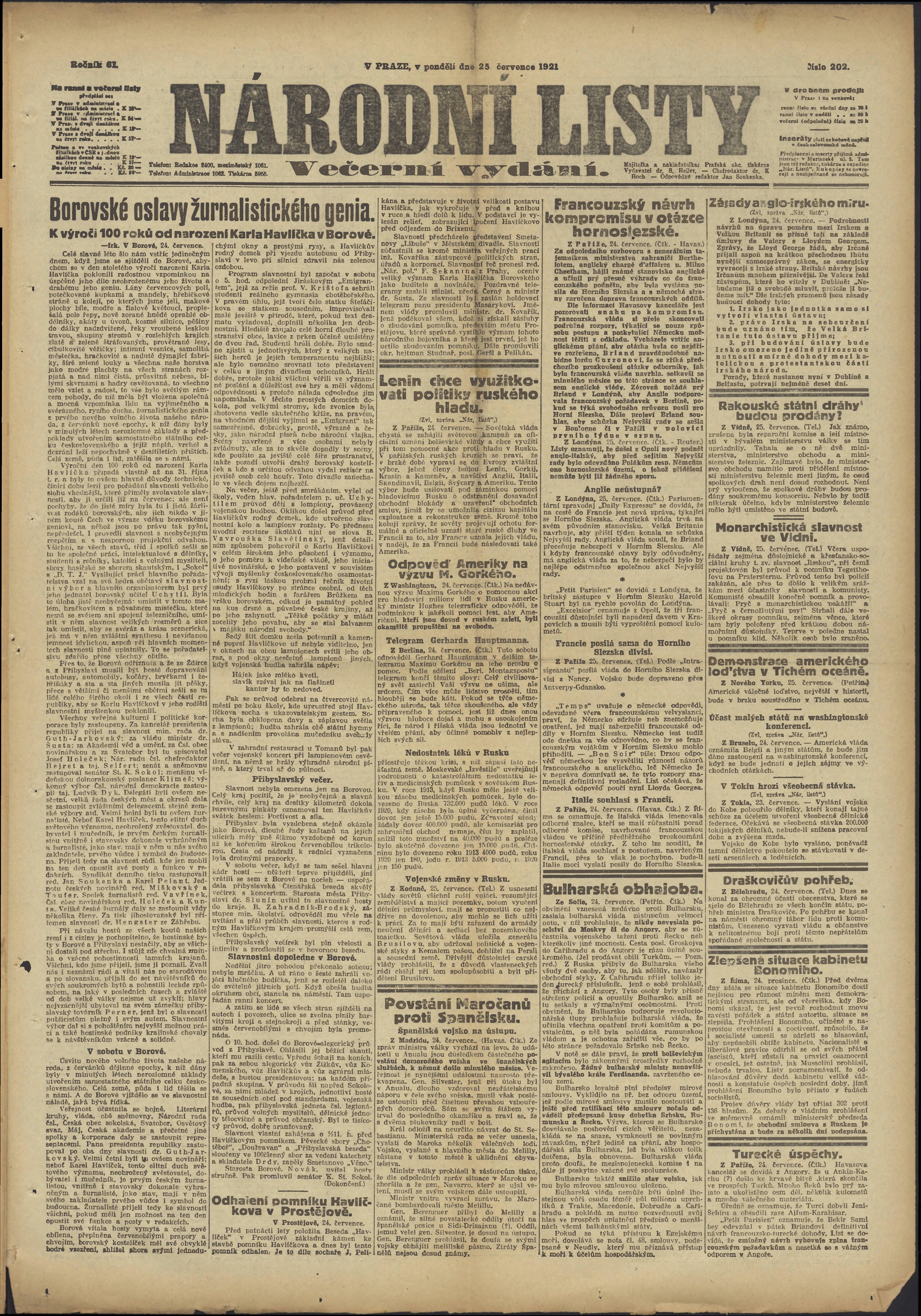 * Datum vydání výtisku: 25.7.1921 Číslo výtisku: 202 Poznámky k výtisku: večerní vydání;